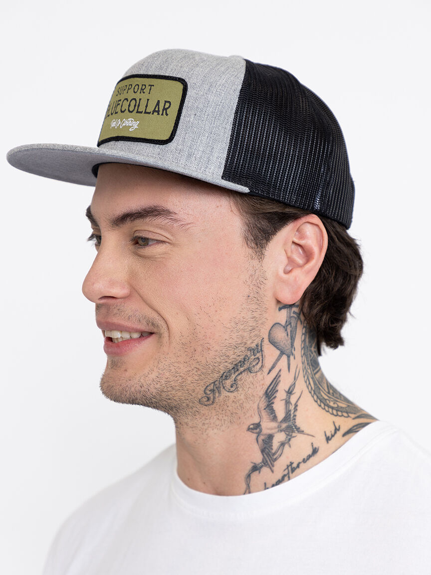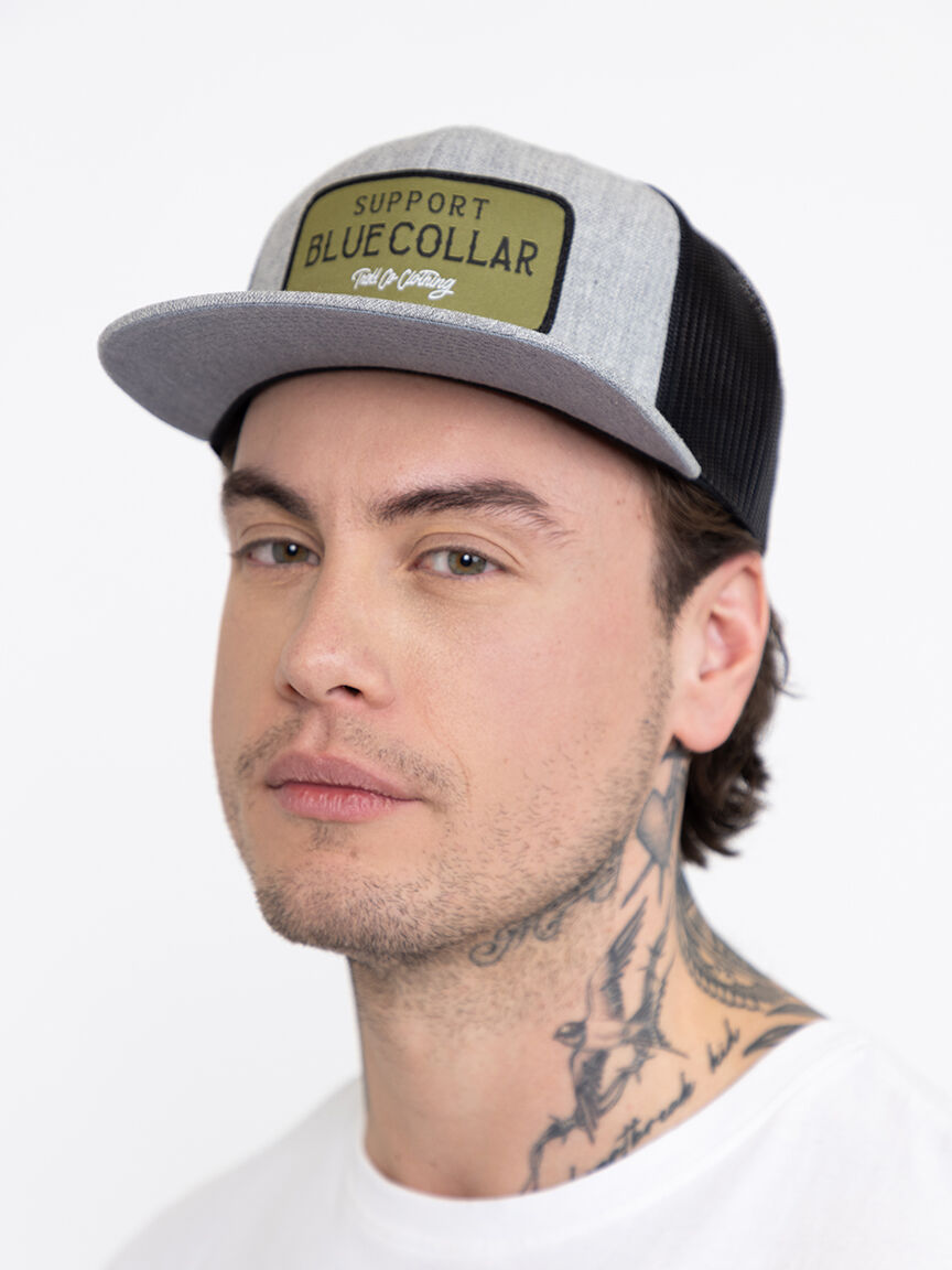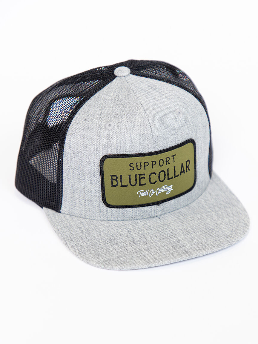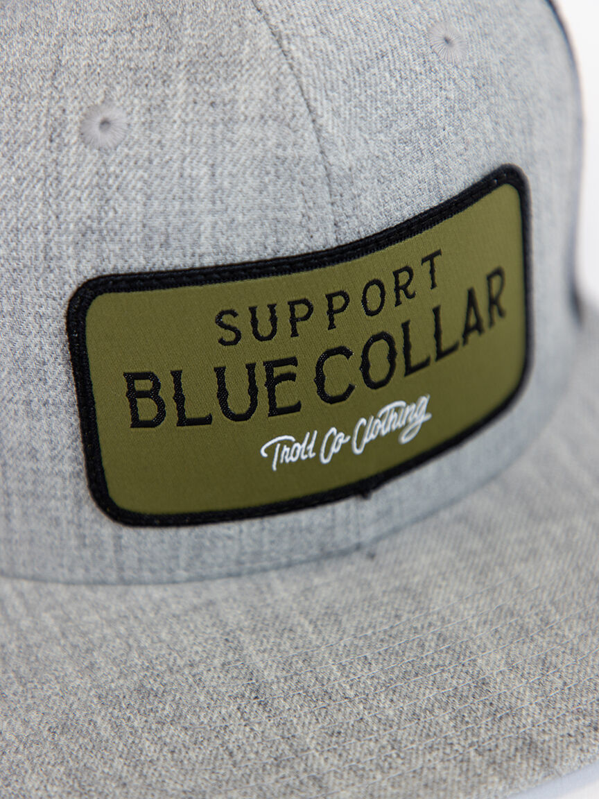 Blue collar work isn’t just a matter of circumstances – it’s a way of life. With the Barricade Hat designed by Troll Co. Clothing, you can let everyone know that you support blue collar work and anyone who works with their hands. Featuring a front patch that states “Support Blue Collar” on a military green background, laid atop a heather grey fabric cap, this hat is the perfect way to show where you stand. Whether you’re a blue collar worker yourself or want to support however you can, this hat is made for you.
