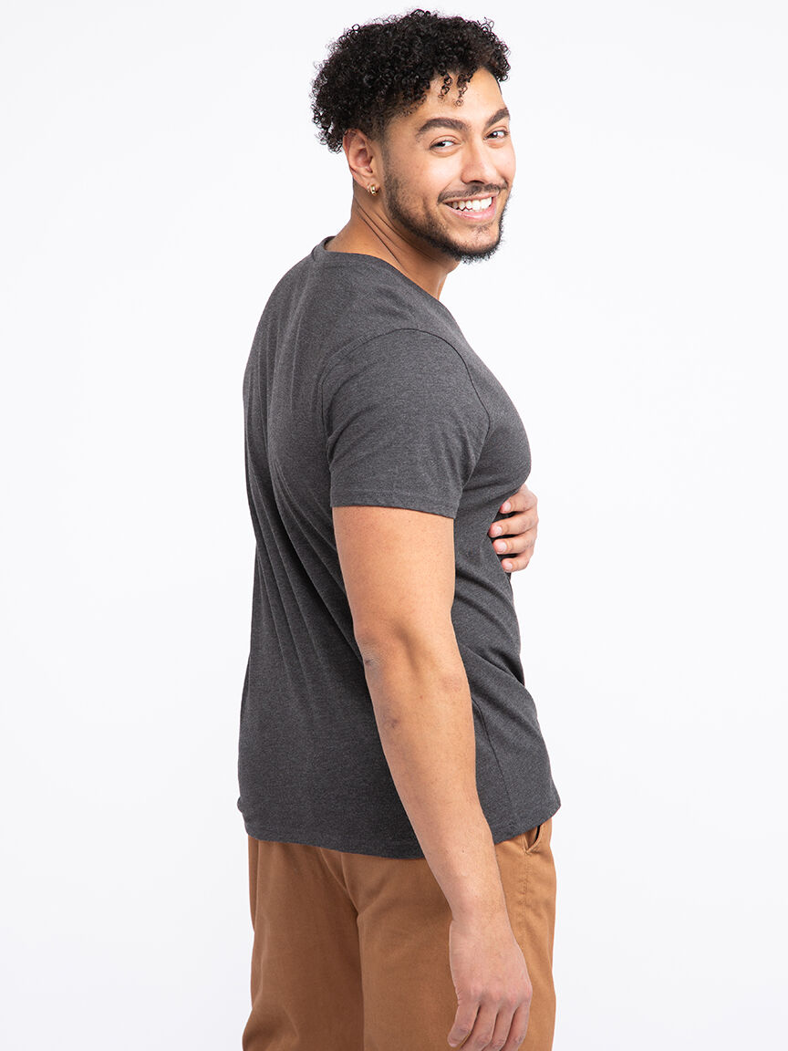 A closet staple, this is a classic fit V-neck tee in versatile heather charcoal.