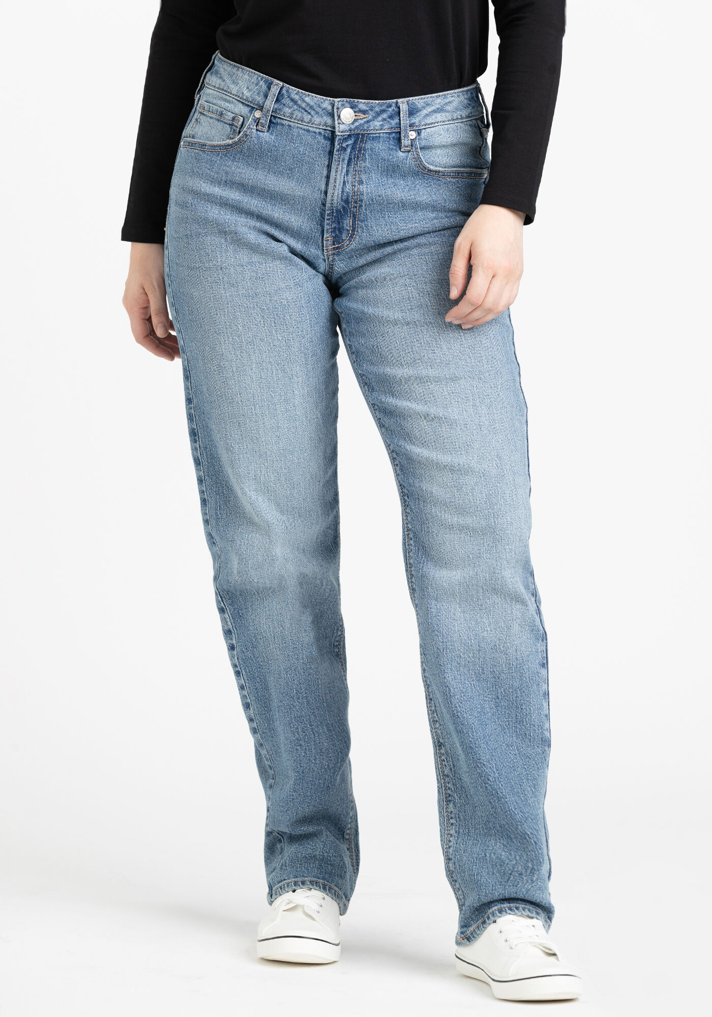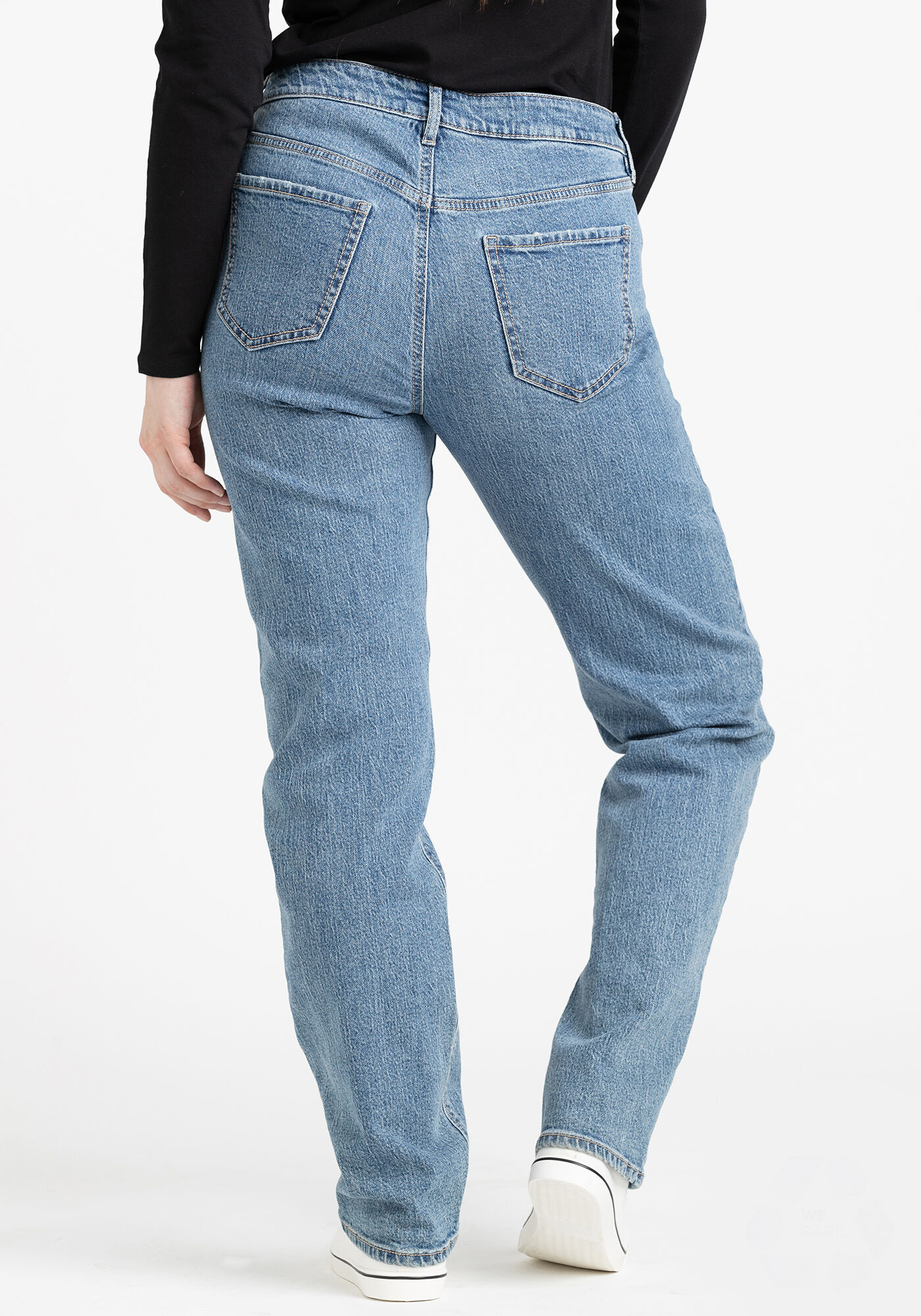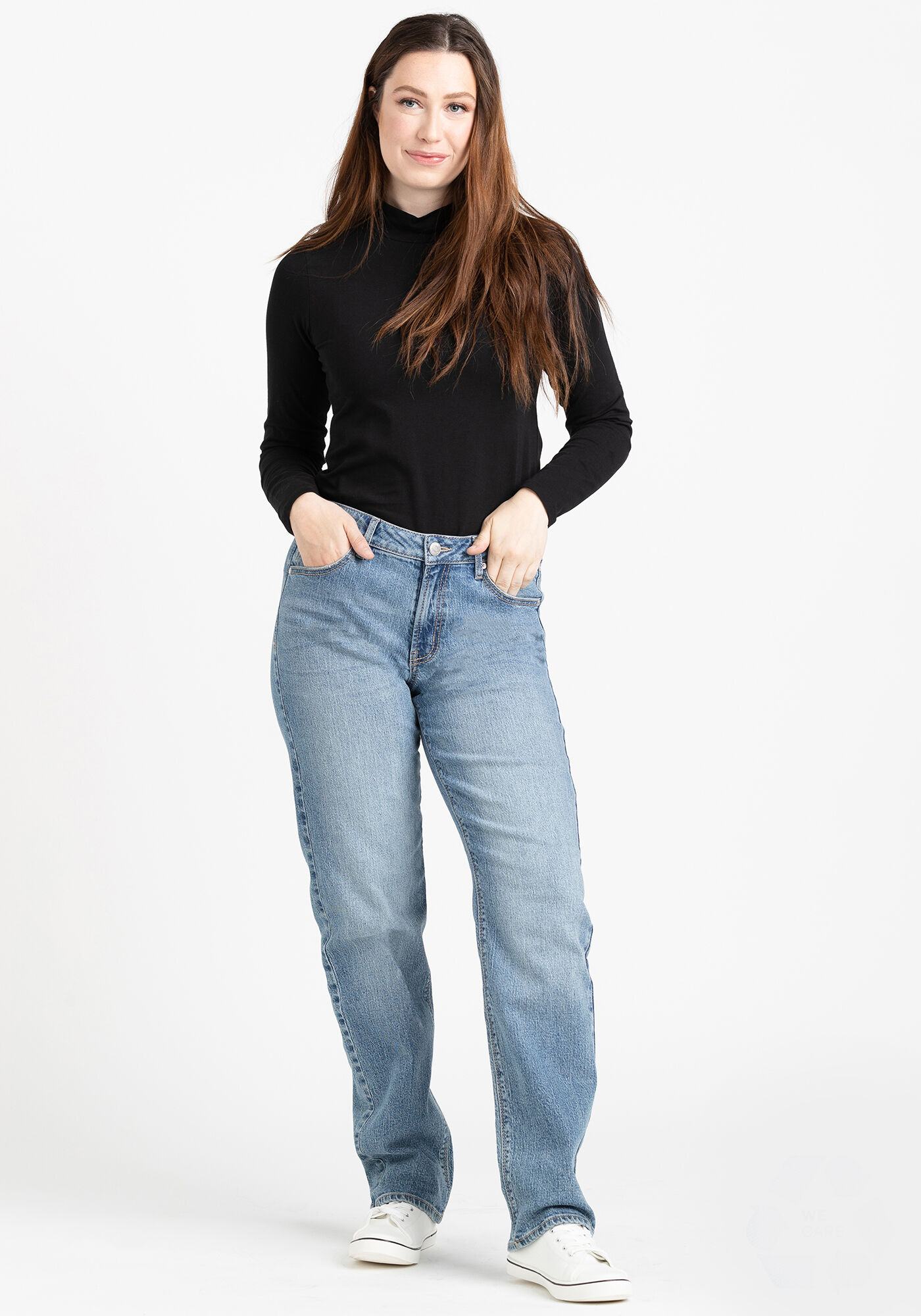 - 90's style, relaxed thigh with loose, straight leg from knee to hem