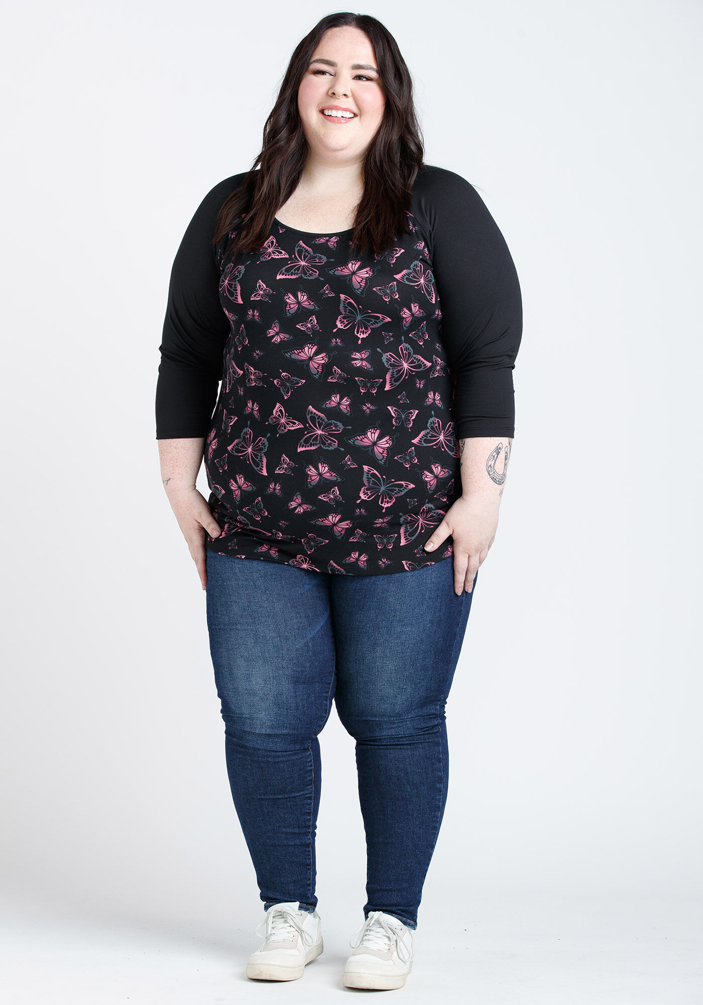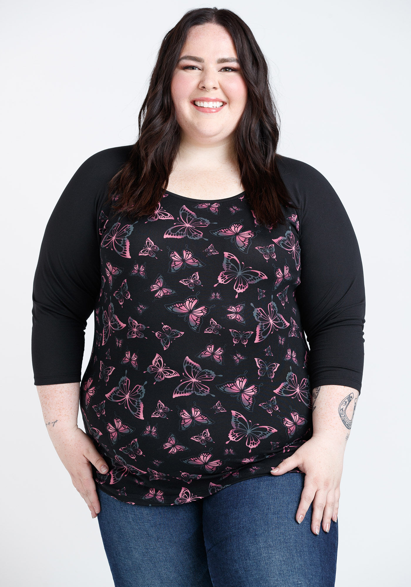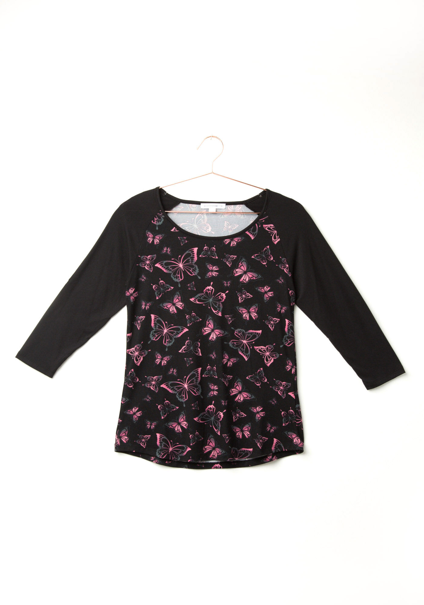 Rated 5 out of 5 by from Awesome Top. Soft, comfy, & wears well. I wash inside out. Fits big. I went down a size to XL. Material is lightweight but not to thin or see through. Can easily be layered with a tank. Love the pink and black. The butterflies are cute too.