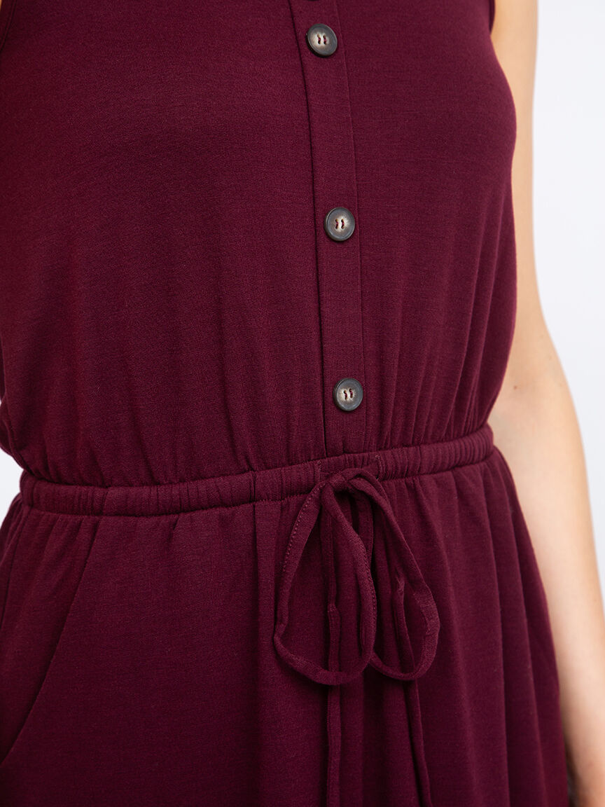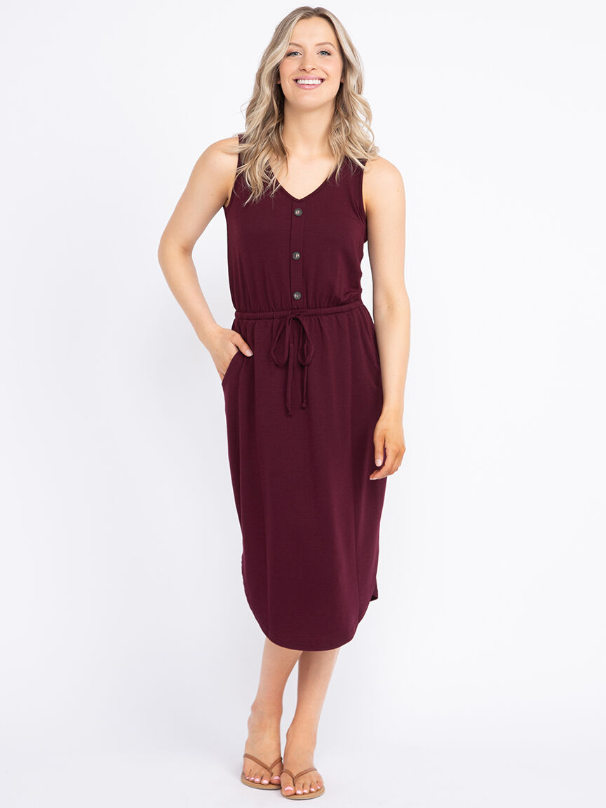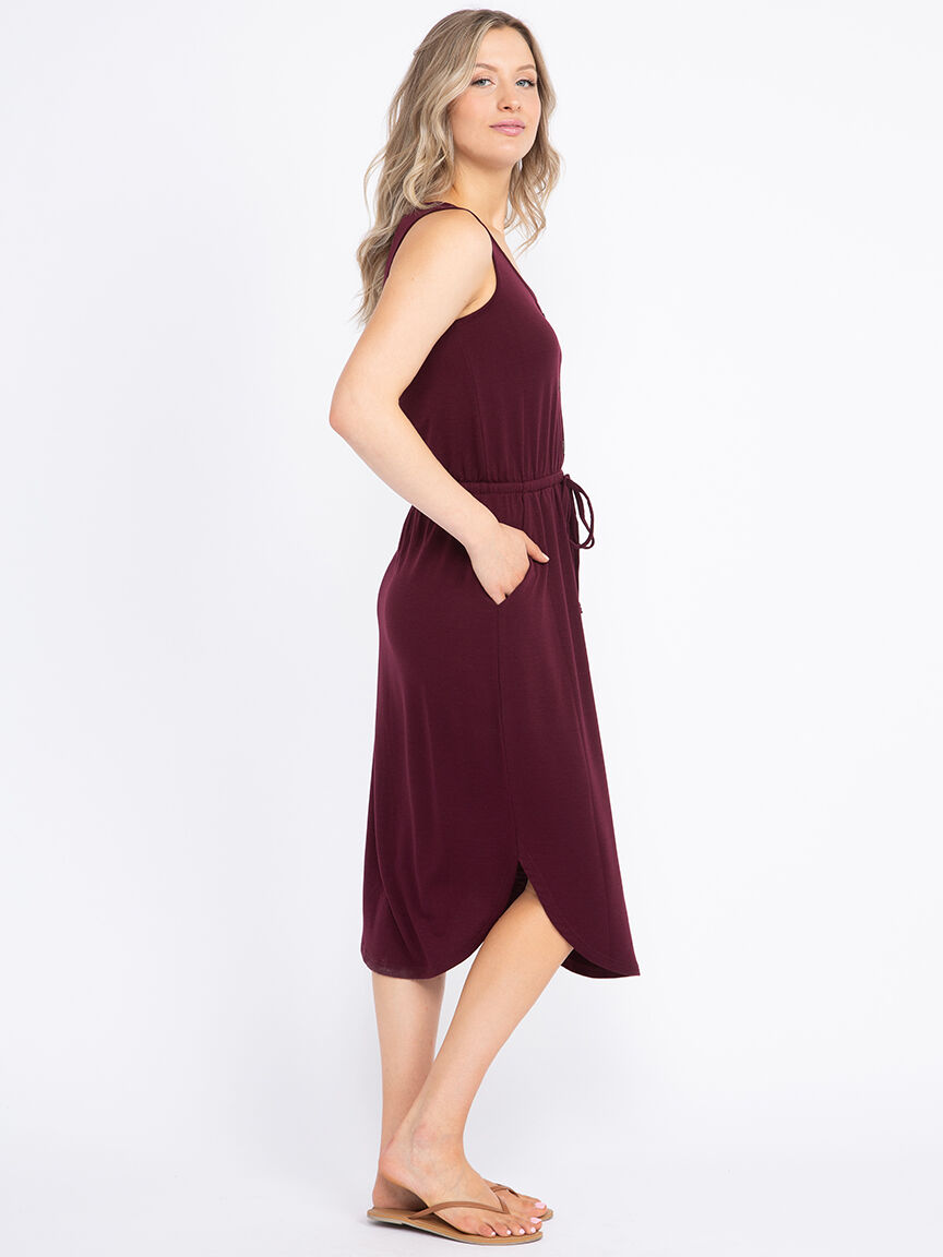 Rated 5 out of 5 by from Comfy dress with pockets I absolutely love this dress. Bought the green one last summer and this year one in black and burgundy. Soft comfy material with pockets. The draw string waist is a nice feature. I love it for travel.