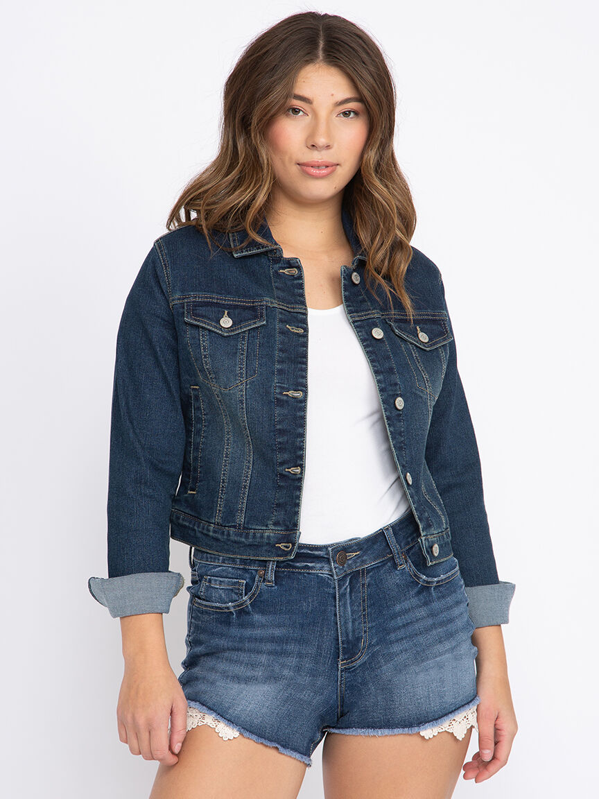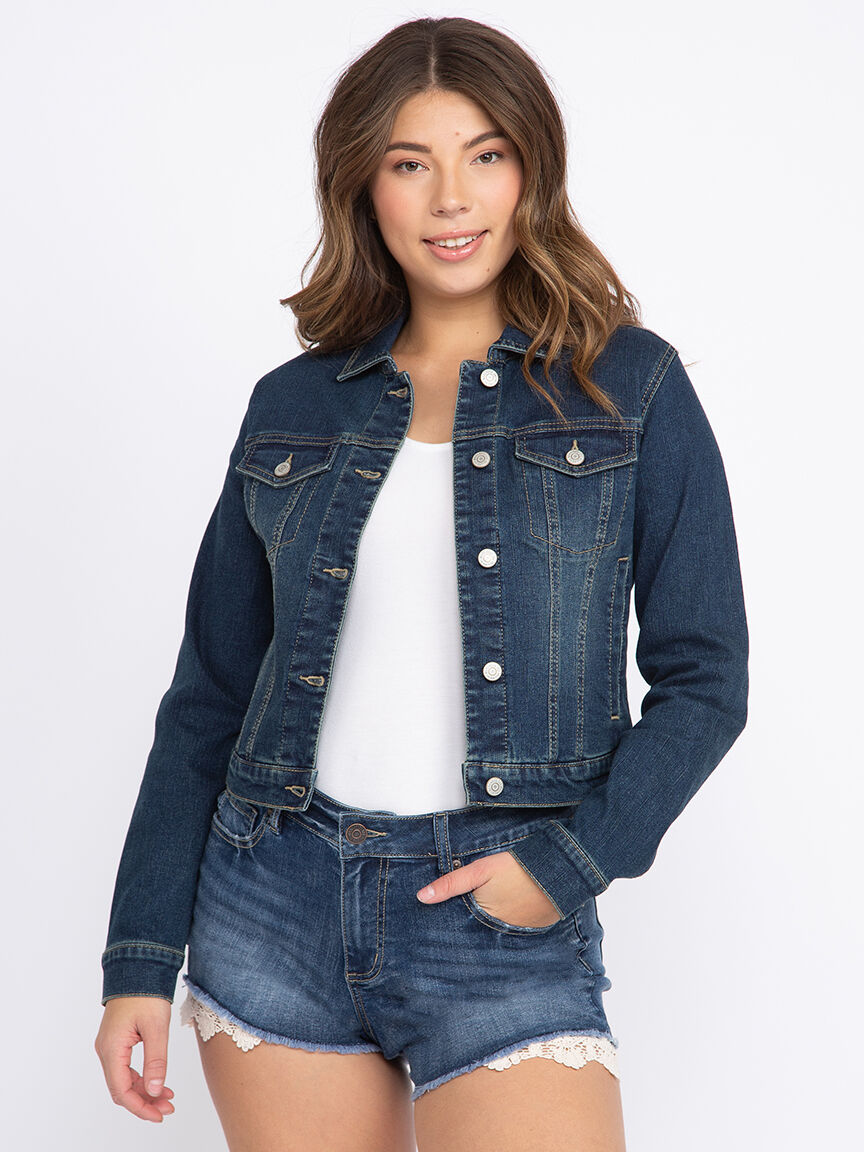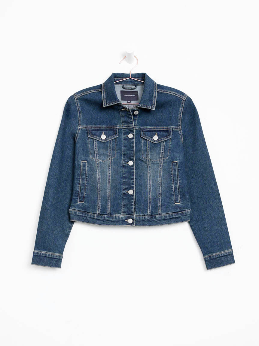 - Cropped length, classic dark wash demin jacket