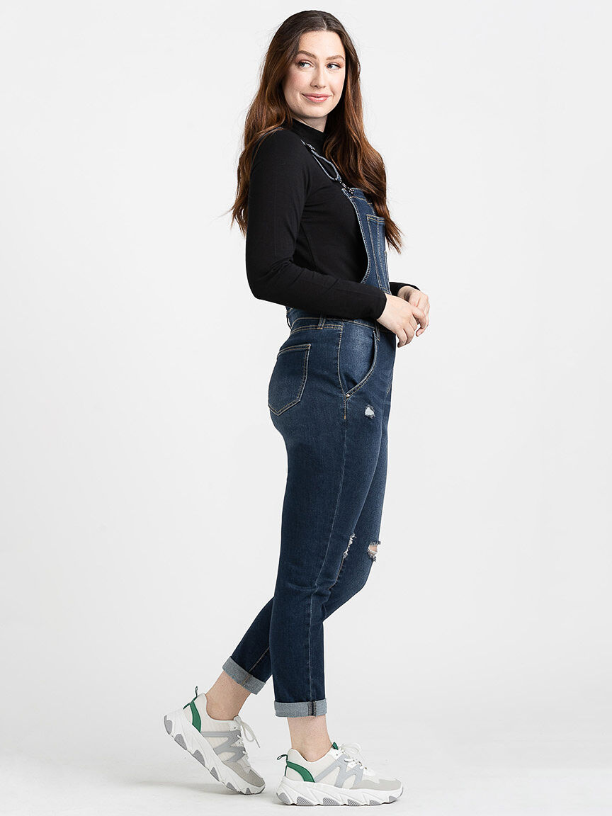 Women's Destroyed Slim Cuffed Overall Jeans
