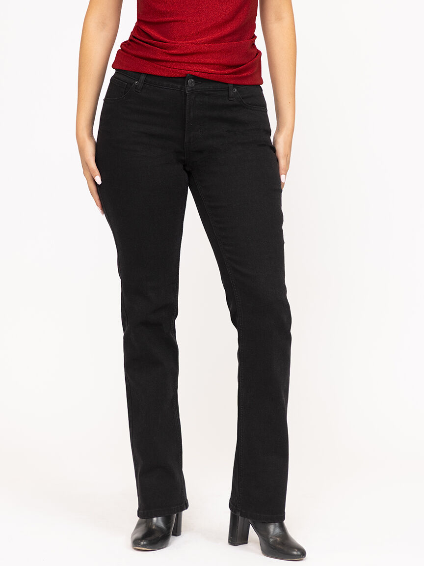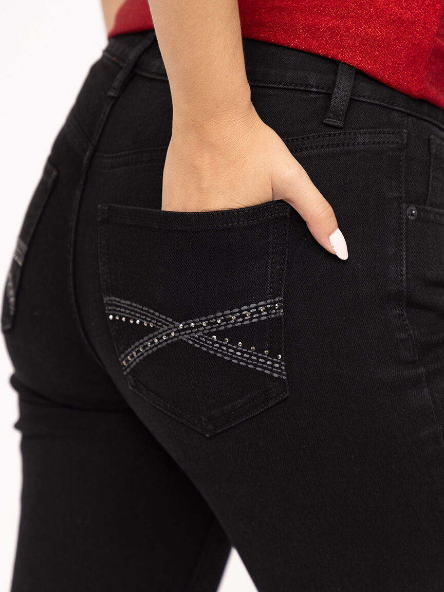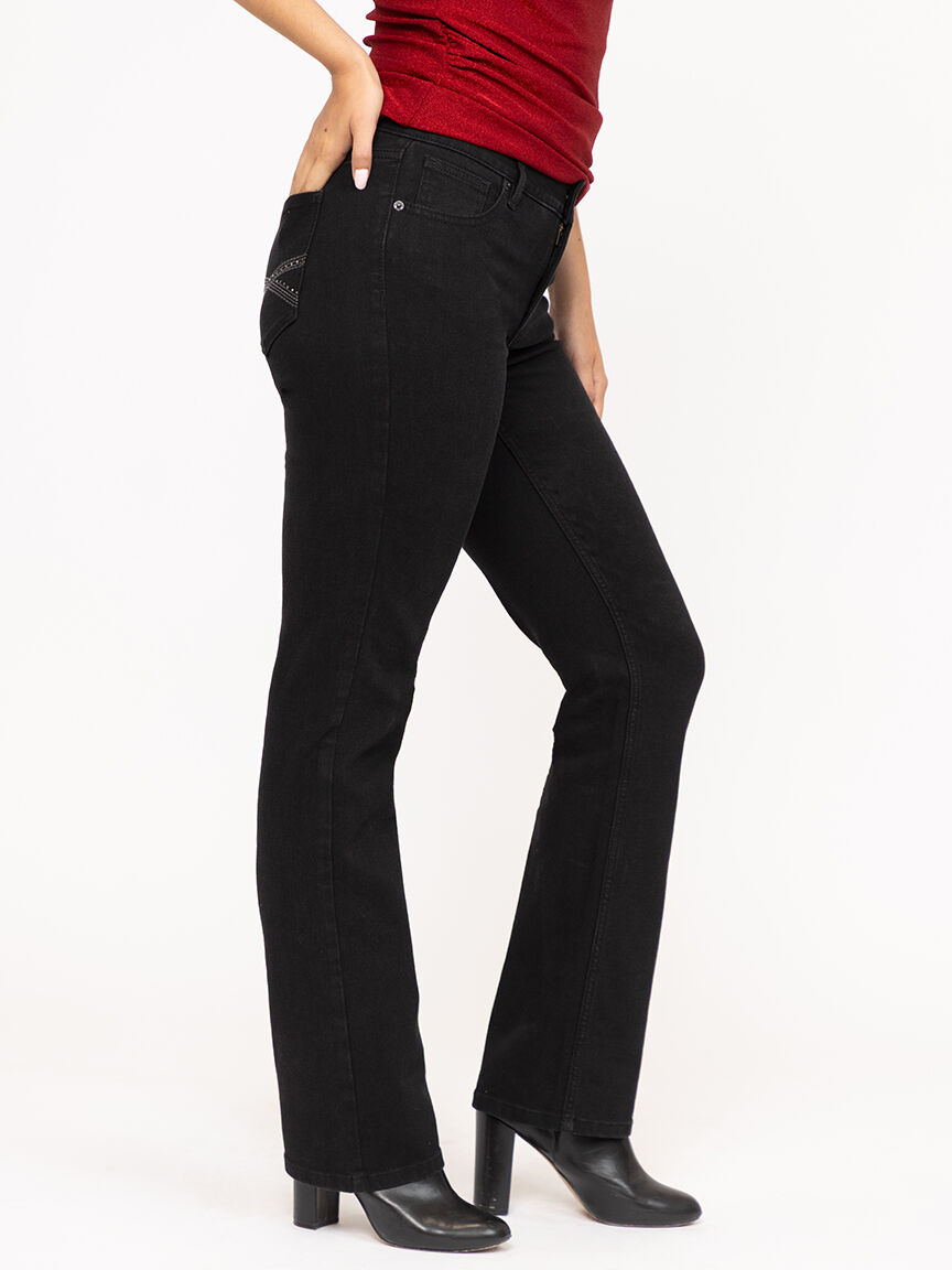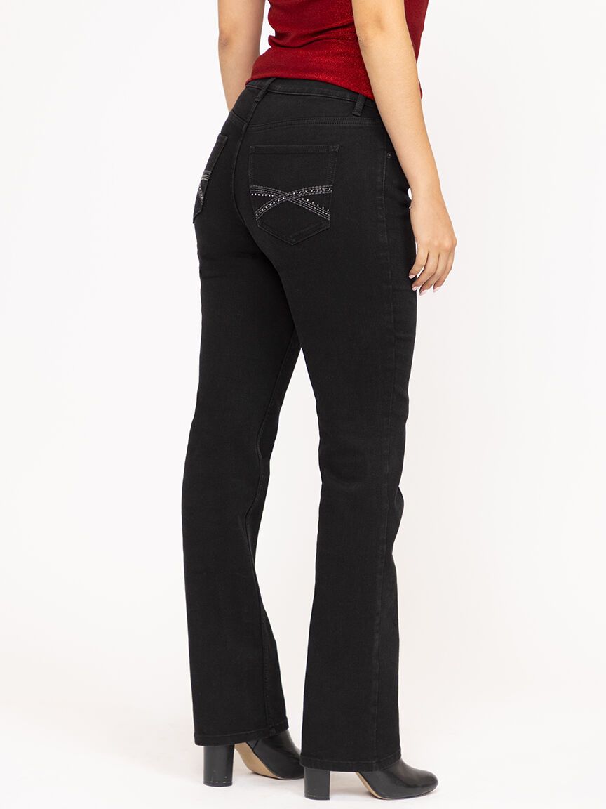 Rated 5 out of 5 by from Embellished black straight leg jeans Very comfortable jeans at a good sale price! Love that they have regular sizes for short woman!