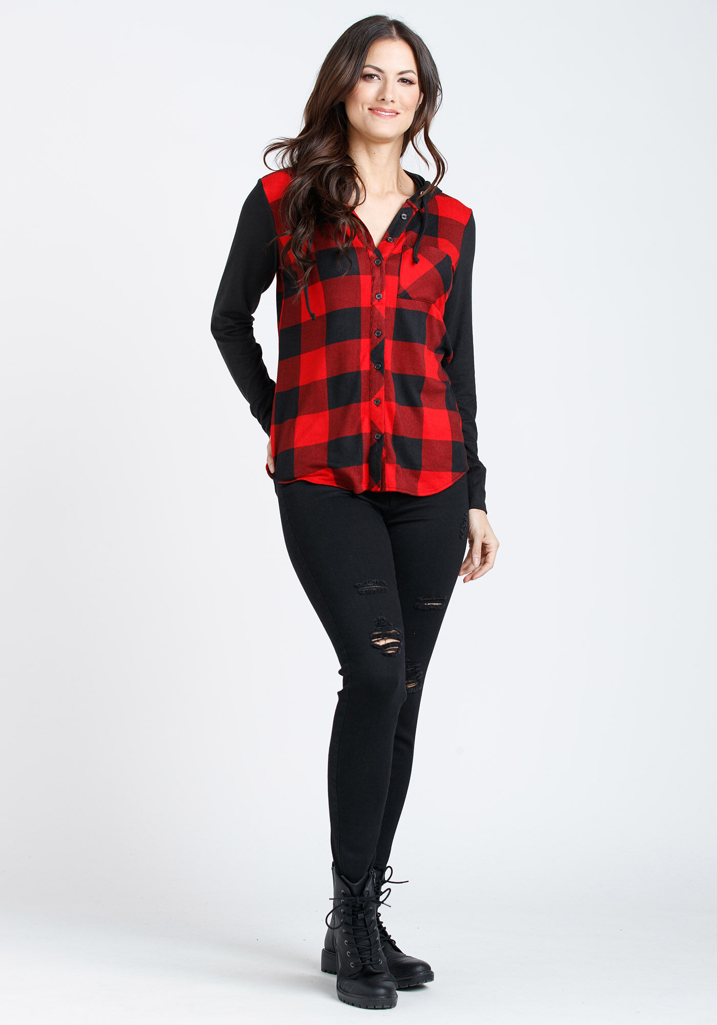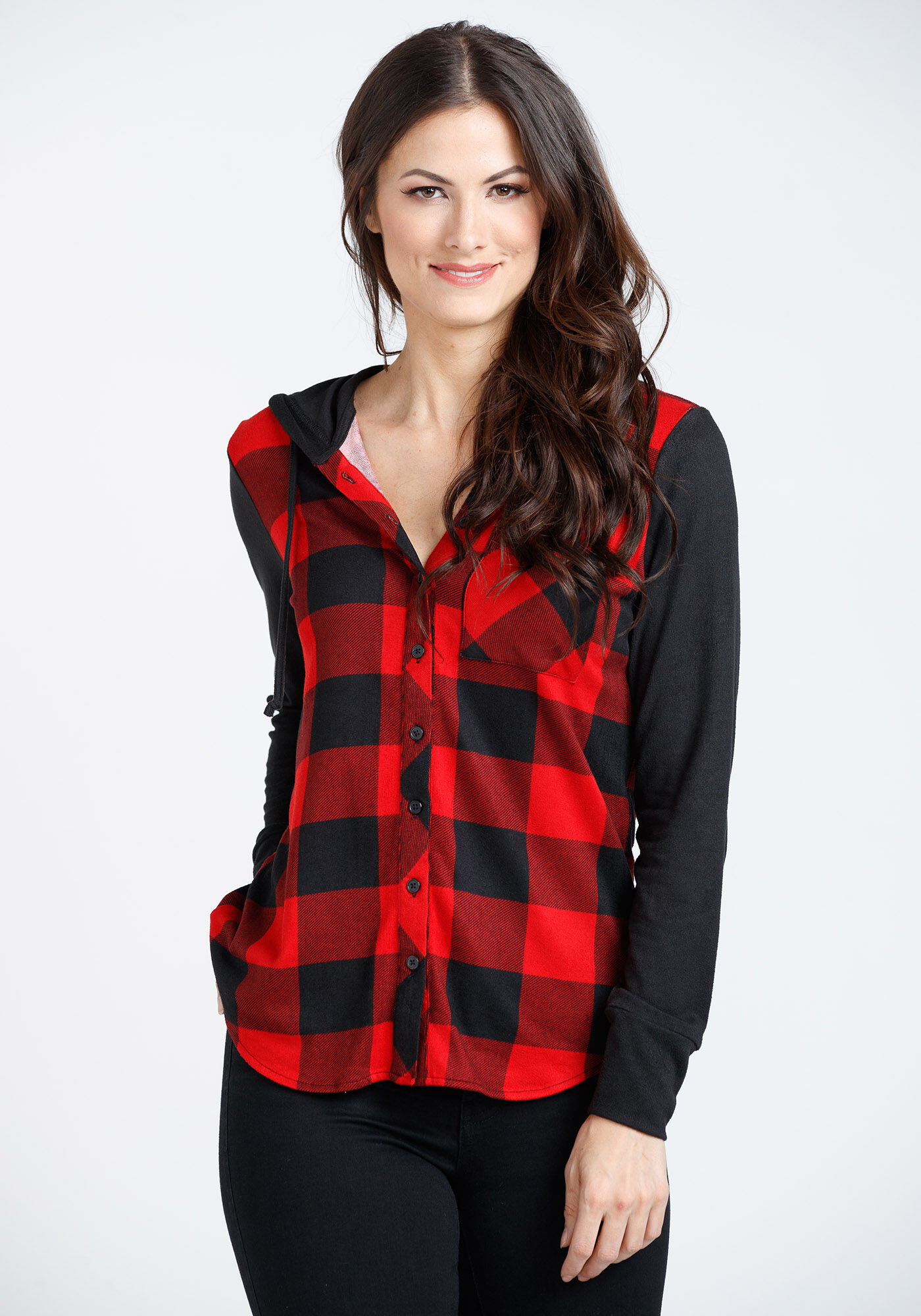 Women's Knit Hooded Buffalo Plaid Shirt Image 1