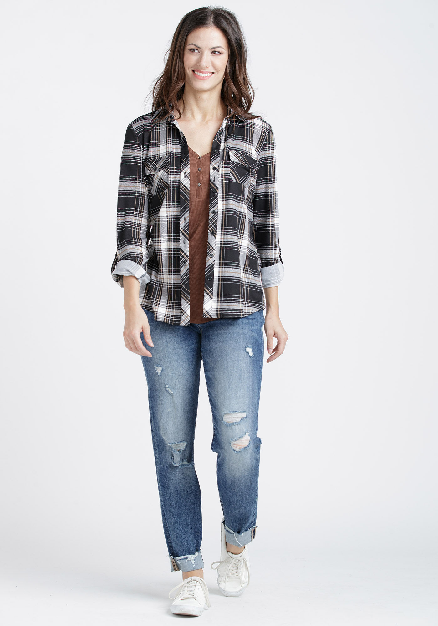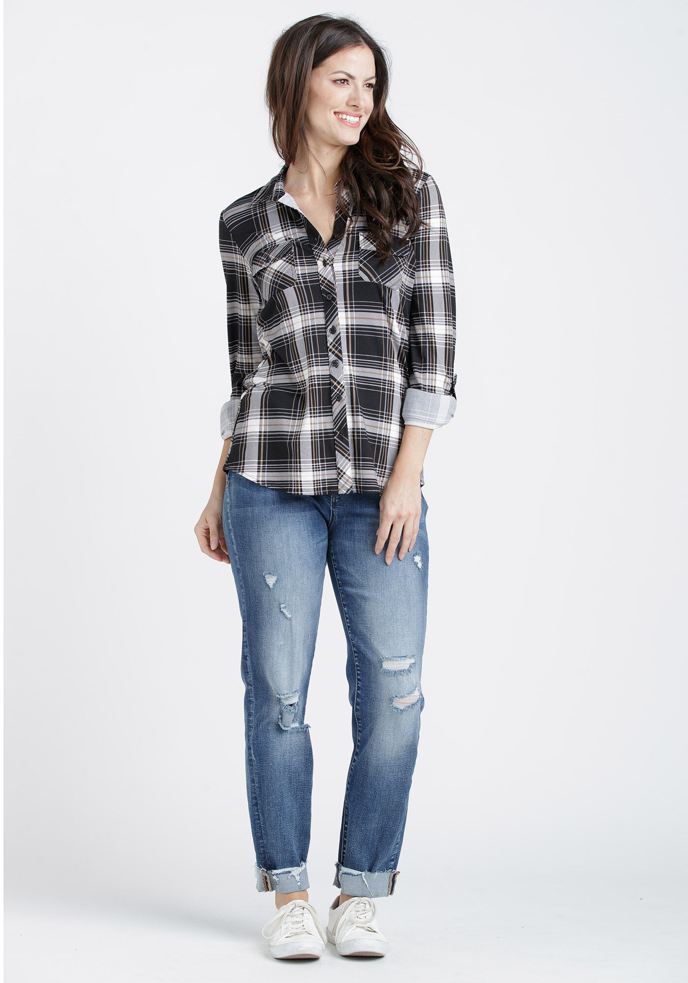 Rated 5 out of 5 by from Great plaid shirt! Not flannel, but just as comfy. Looks great with jeans or tucked into joggers.
