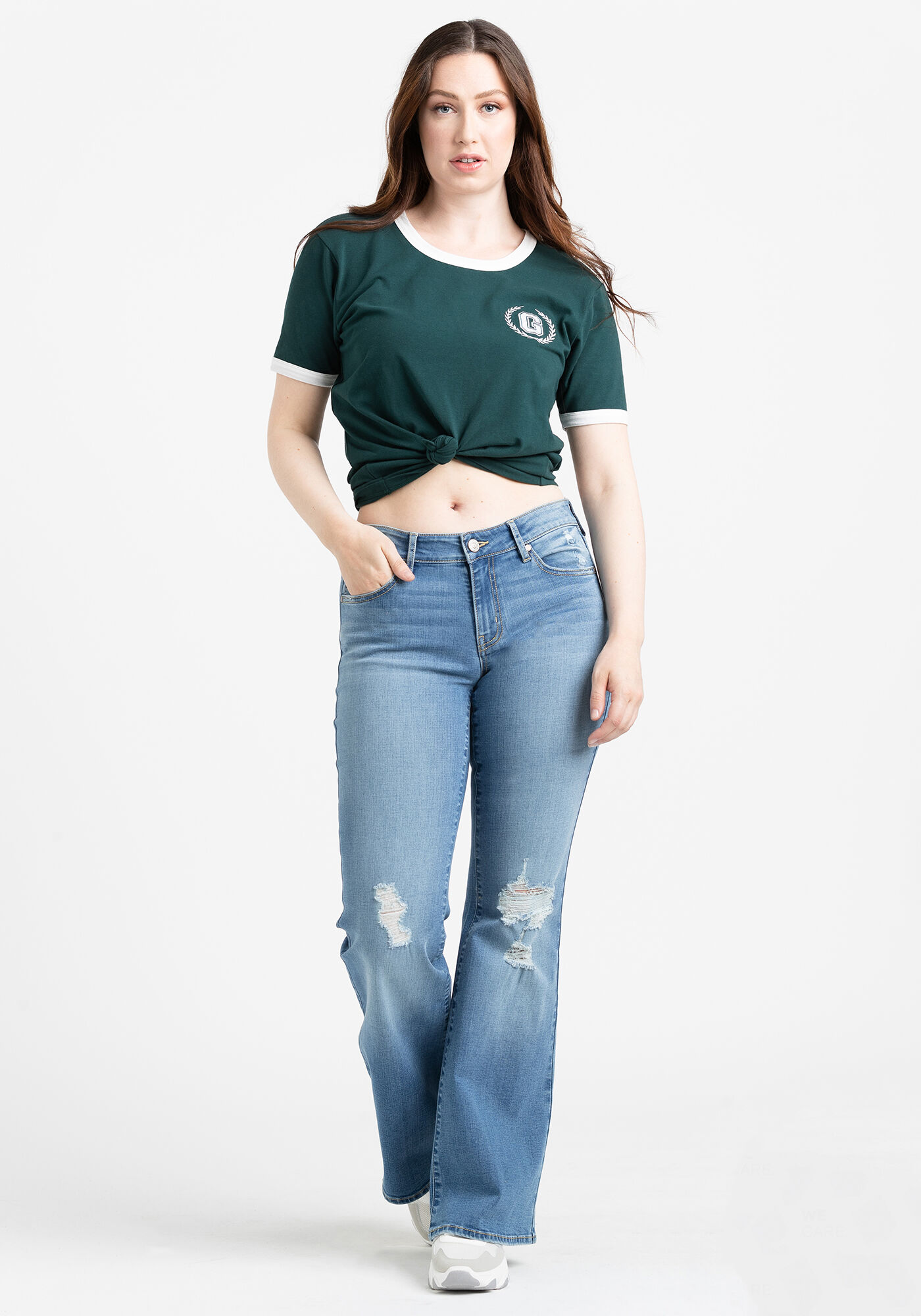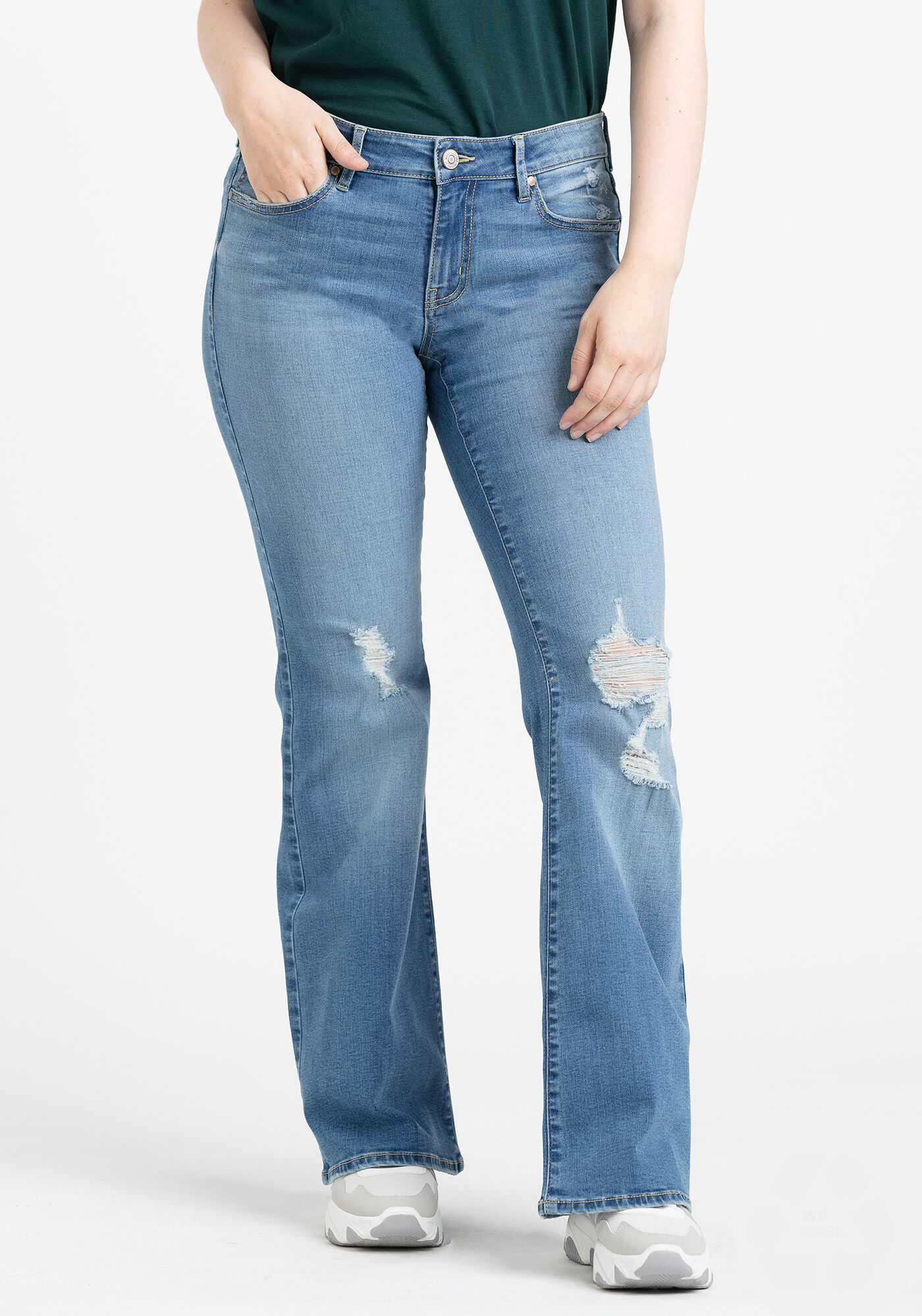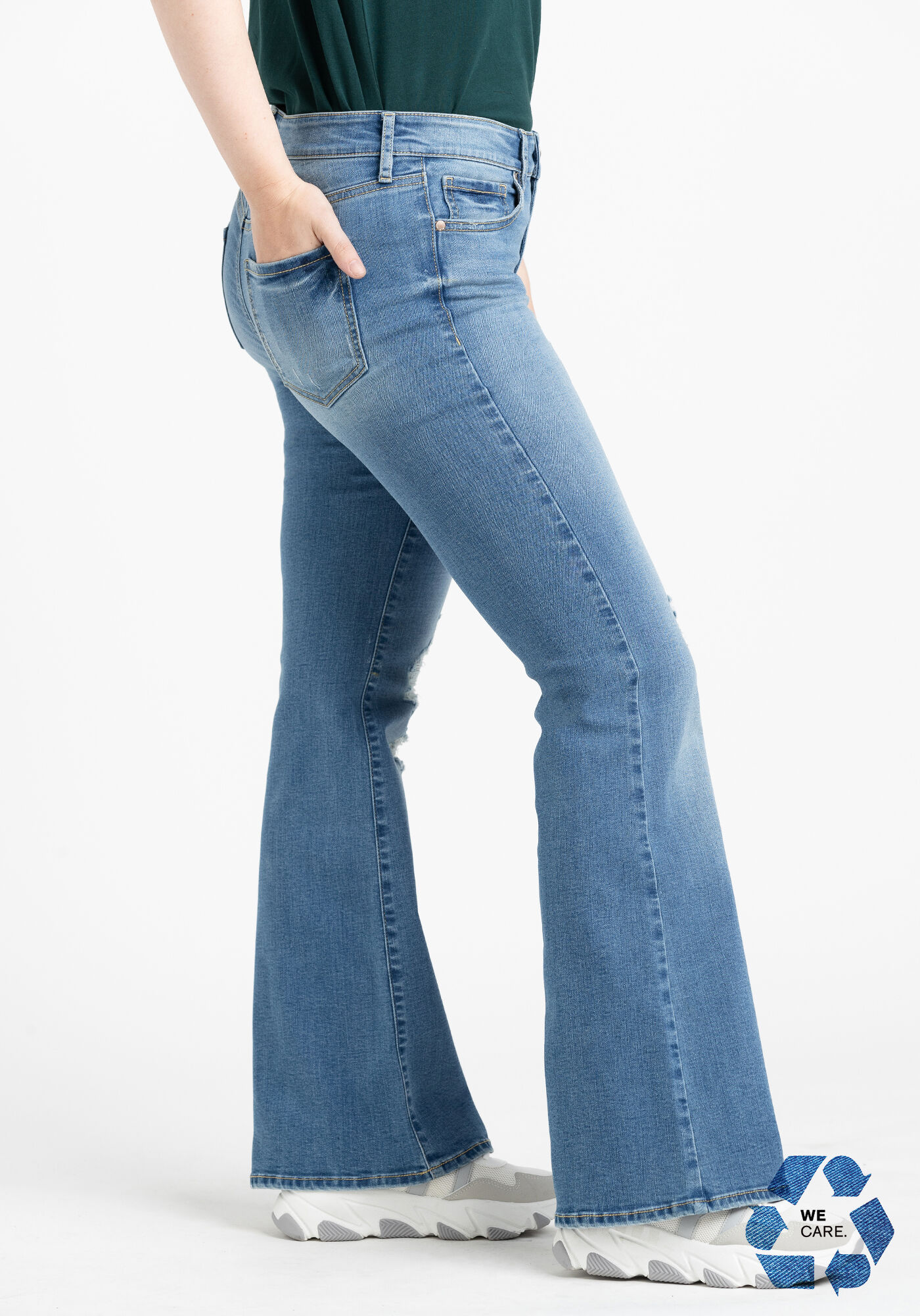 - Sits low at waist, slim through the hip and thigh with bell bottom flair