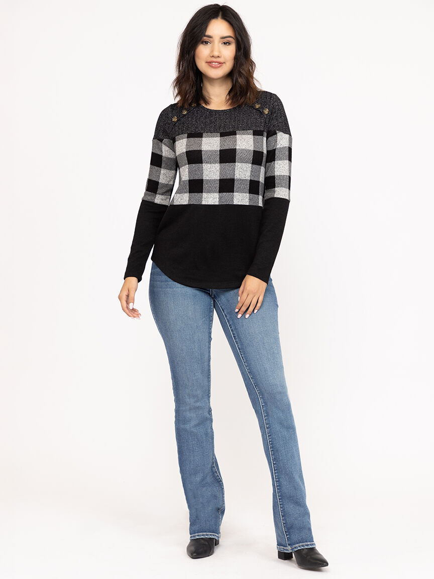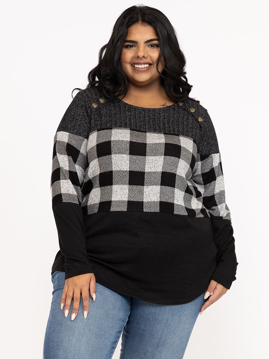 Rated 1 out of 5 by from Poor plaid placement The location of the plaid on a full chested woman is not flattering - design looks stretched and wide