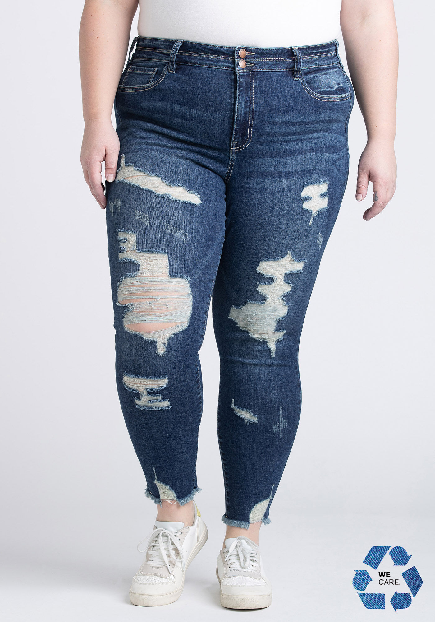 Women's Plus High Rise 2 Button Destroyed Ankle Skinny Jean
