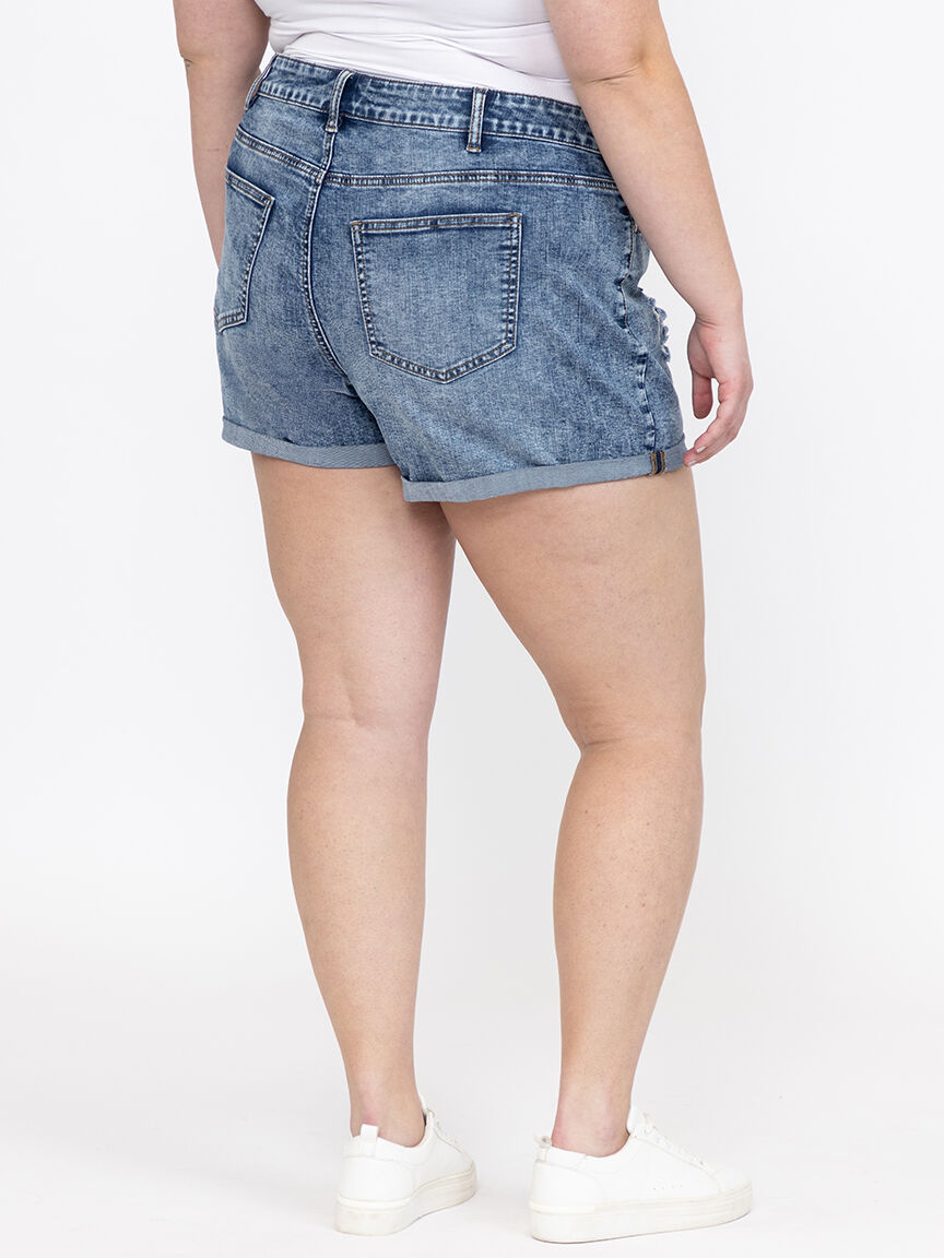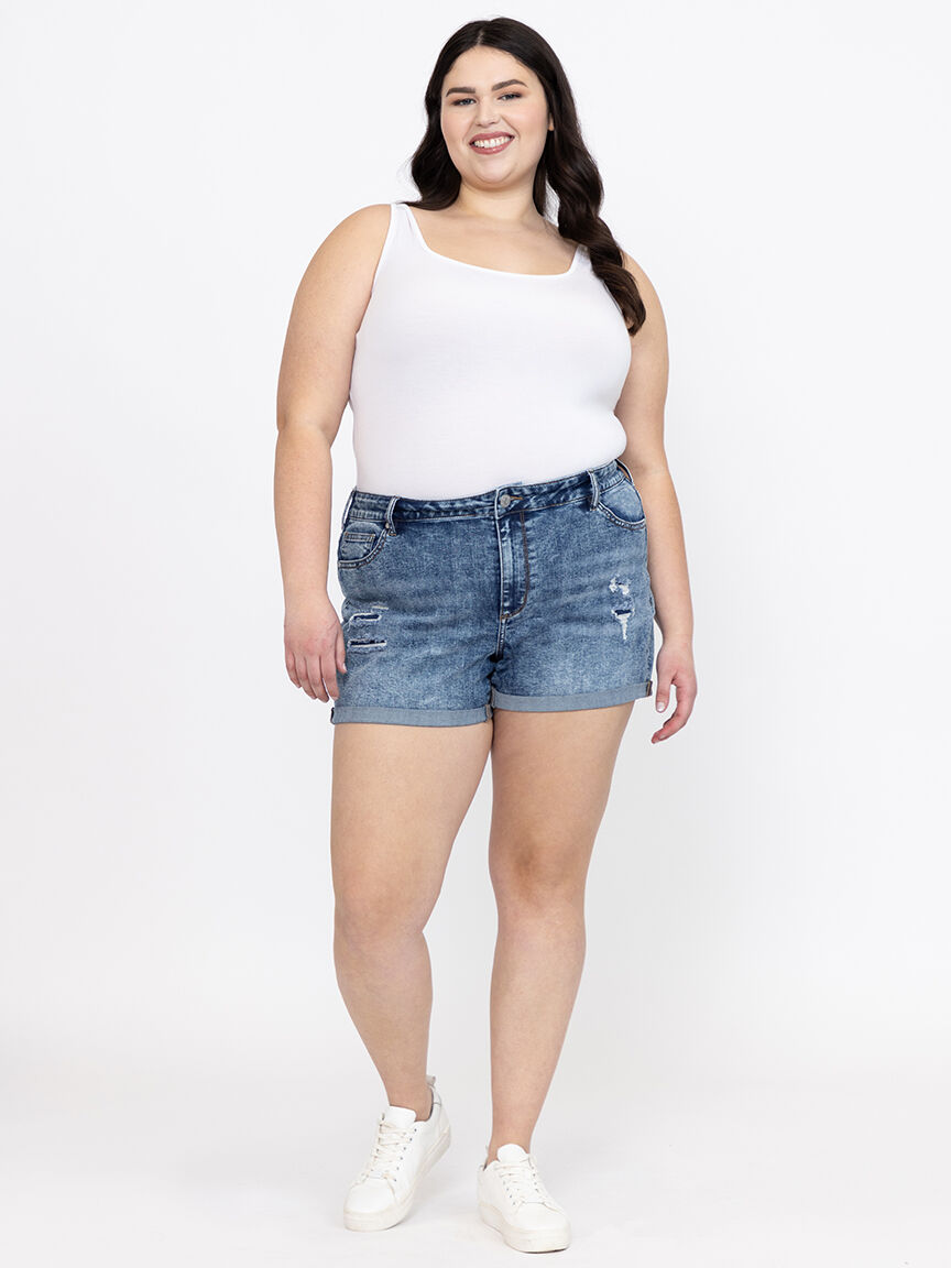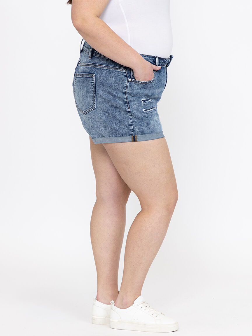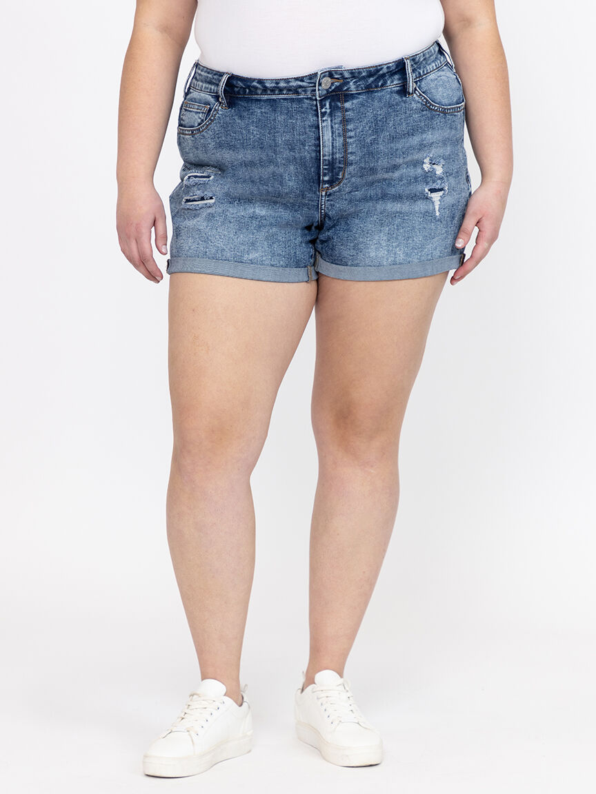 Women's Plus High Rise Rip & Repair Medium Wash Cuffed Shortie