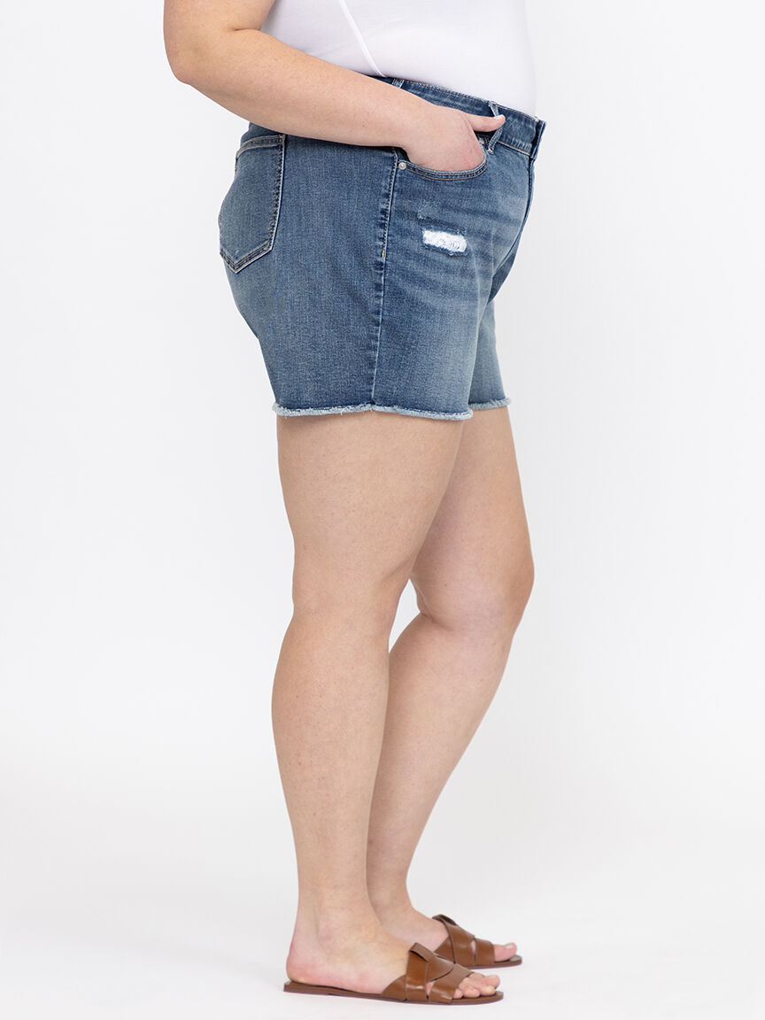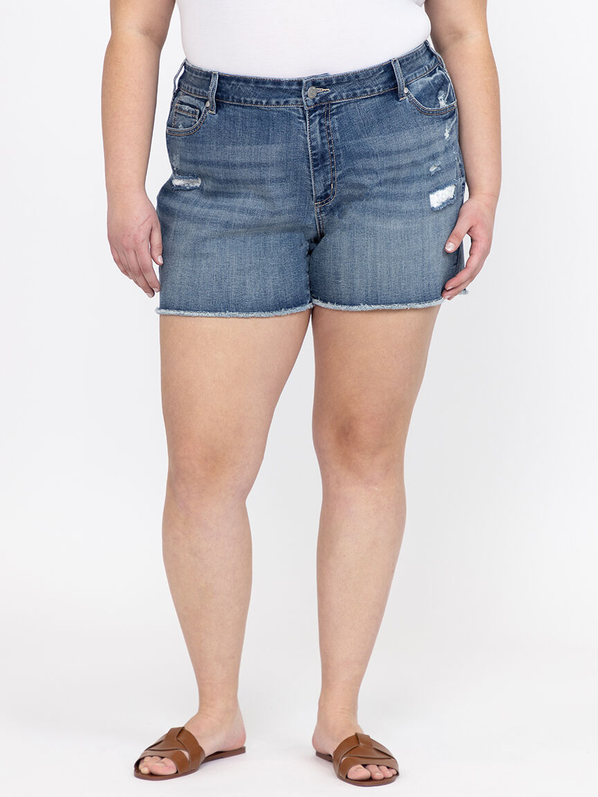 Women's Plus Medium Wash Frayed Hem Shortie with Crochet Lace Insert