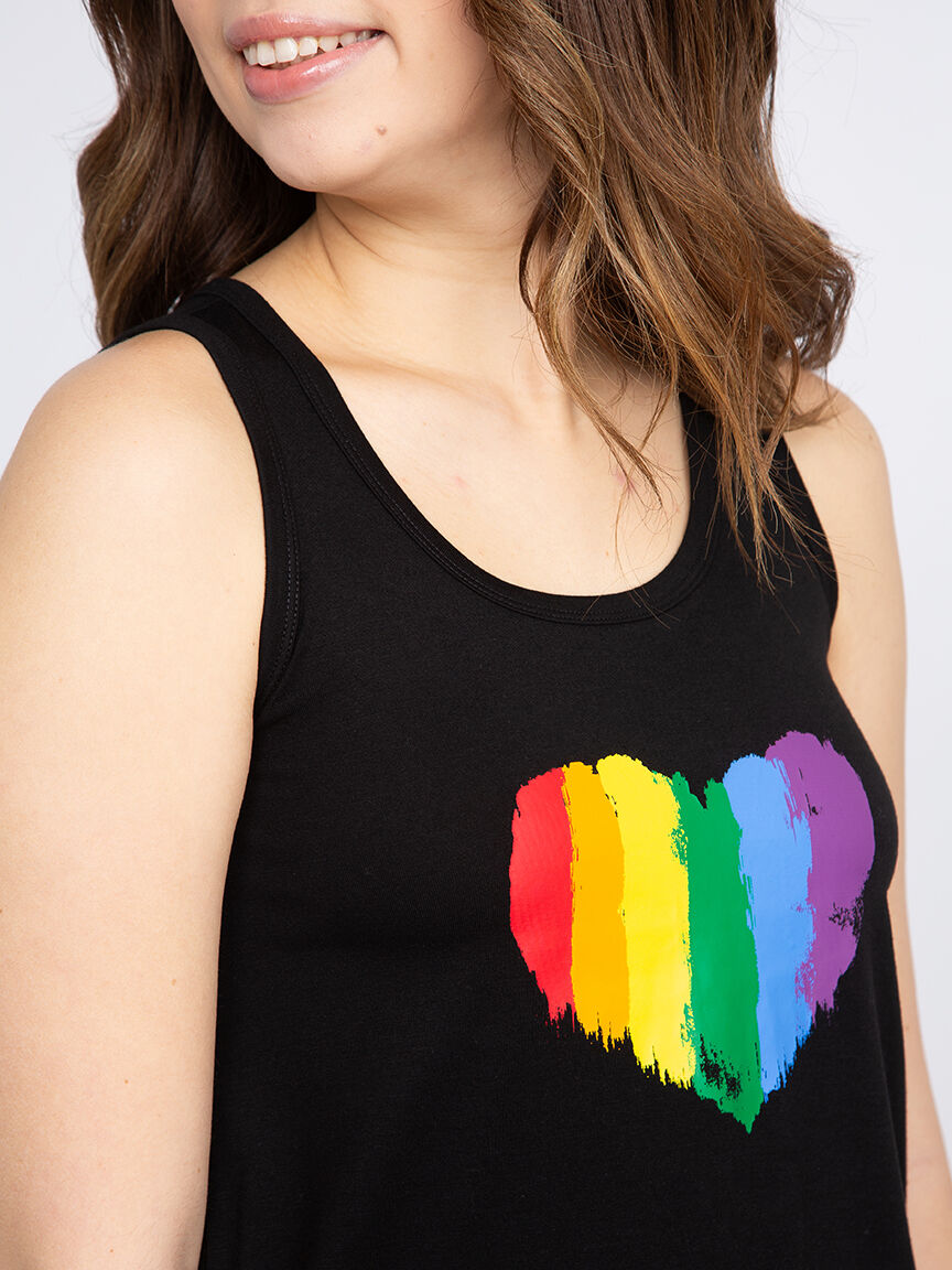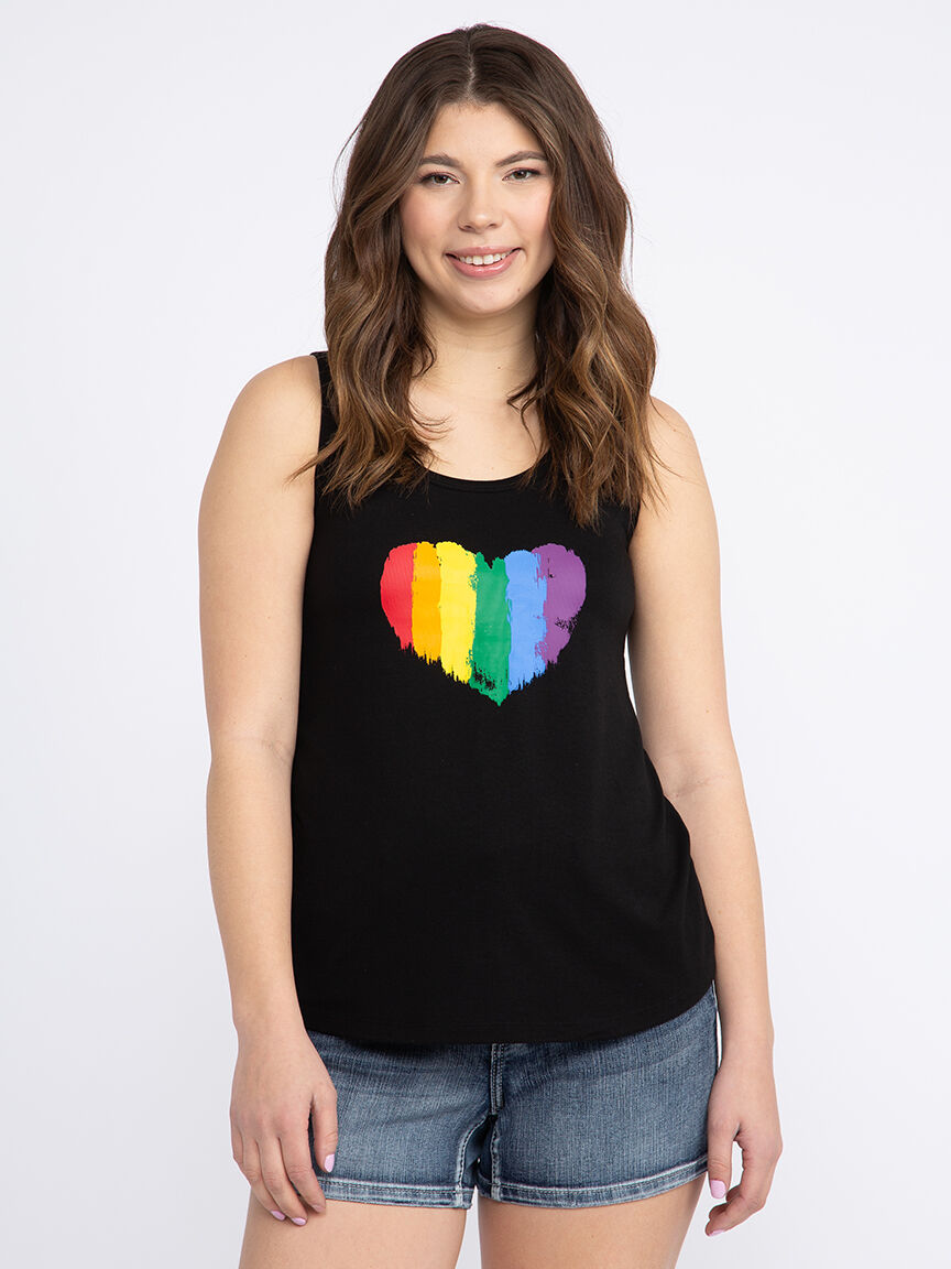 Show your pride with this casual tank featuring a rainbow heart screen print.