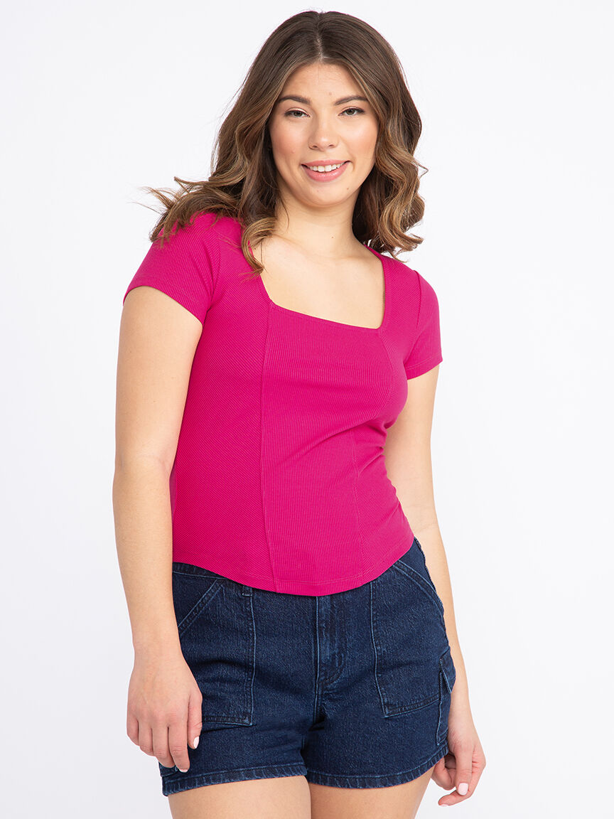 Rated 5 out of 5 by from Ribbed Corset Tee This tee fits really nice. I am petite and the xs fit just nicely. Got the bright pink! Such a fun colour!