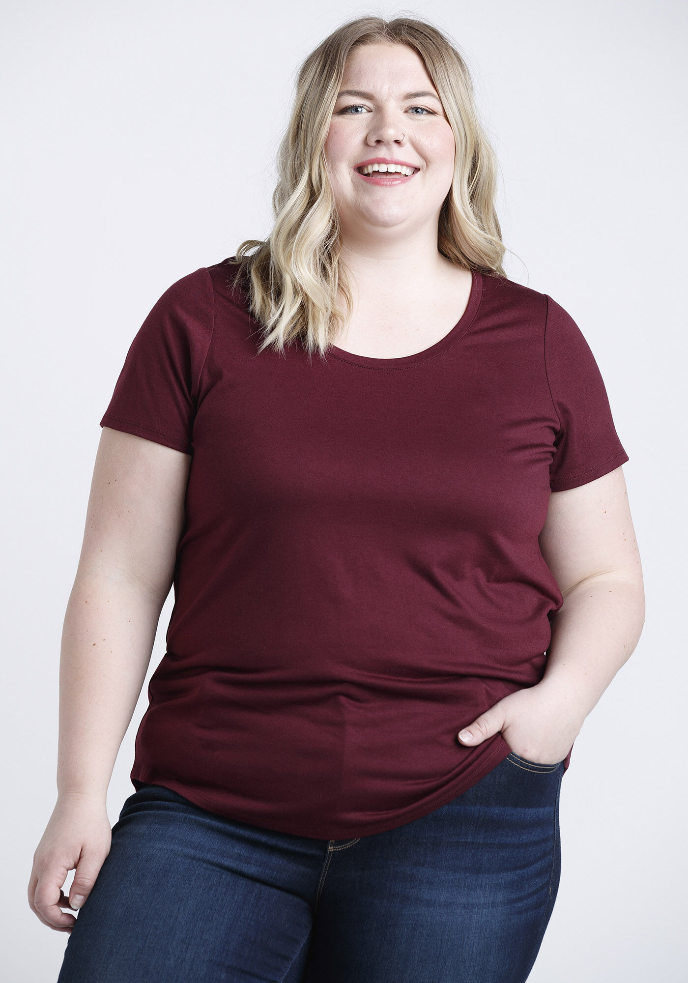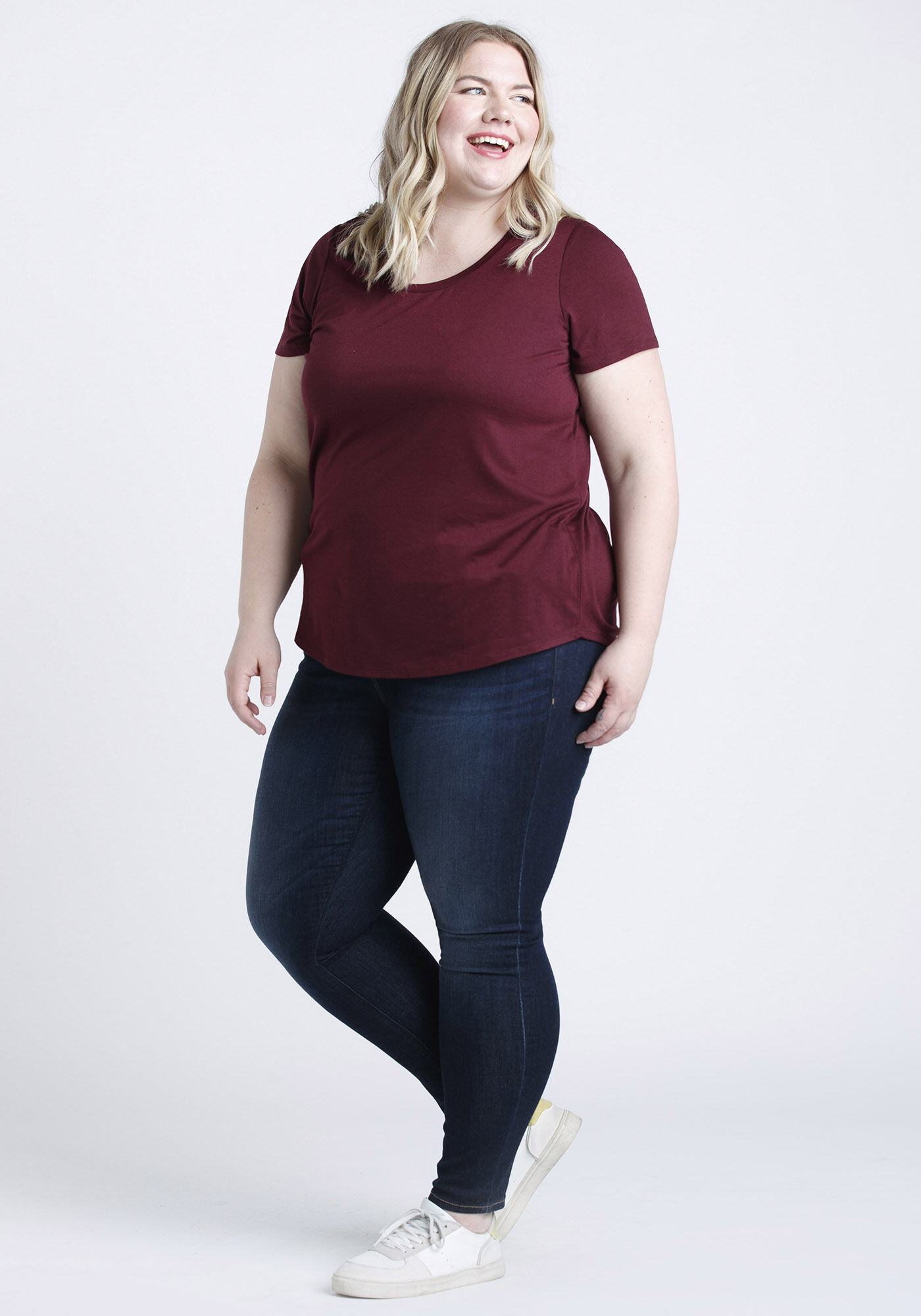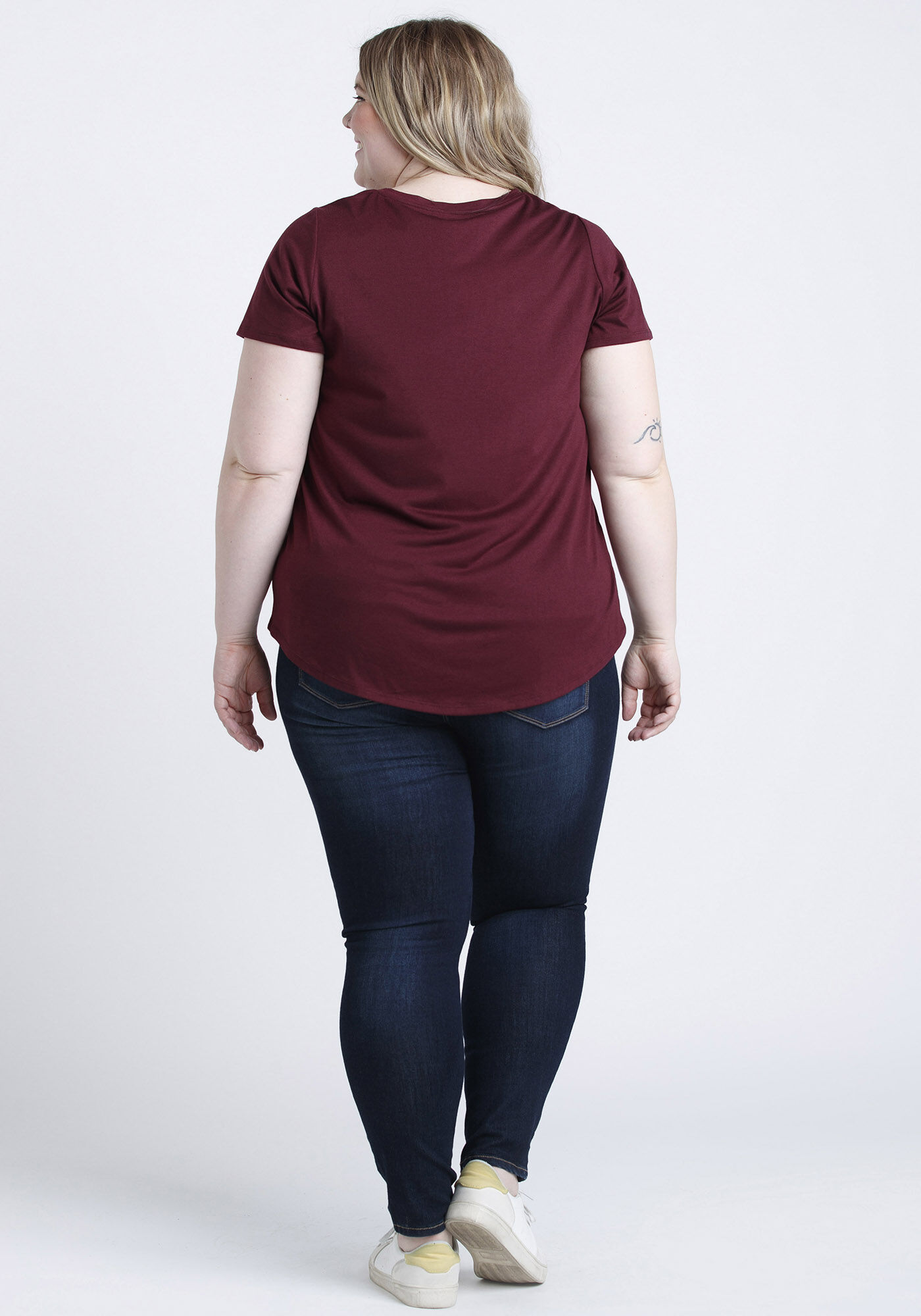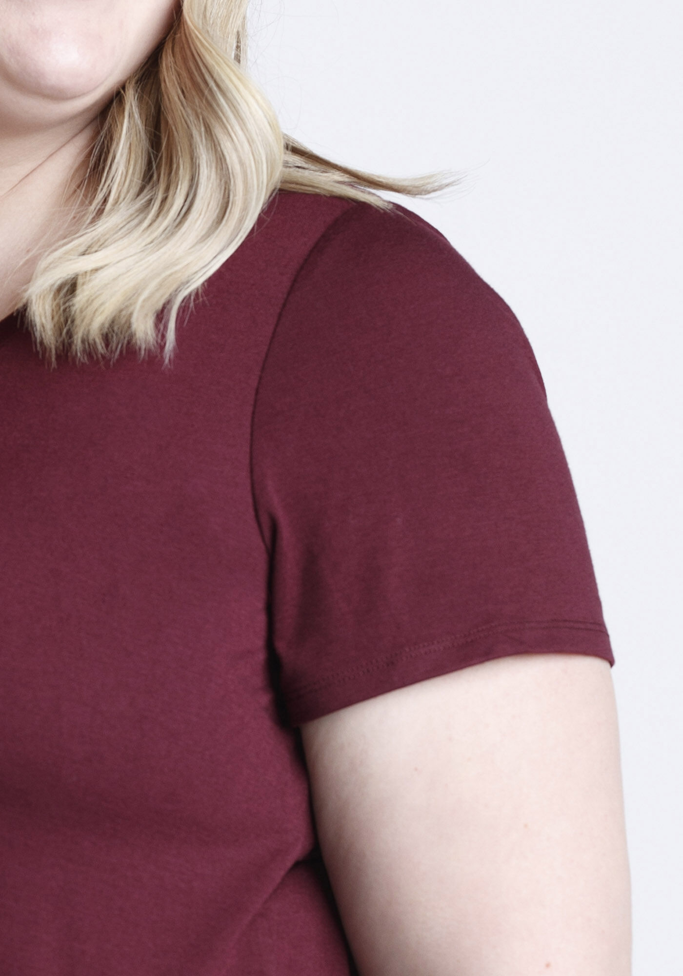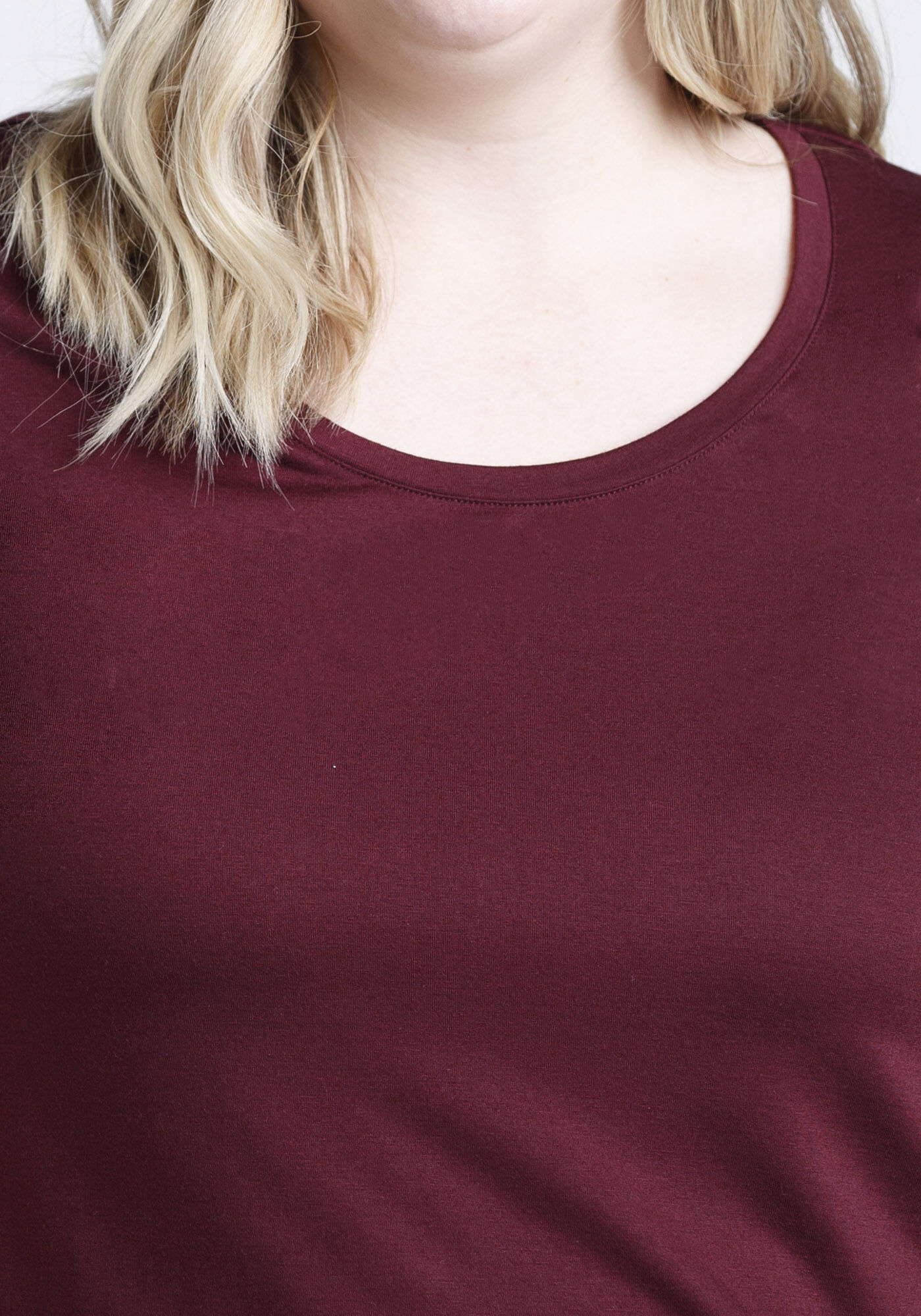 Rated 5 out of 5 by from Love this shirt! Very flattering style. Not super long, but not too short either. Not form fitting, but not baggy. Overall, a great t-shirt in a lovely deep shade of burgundy. Looks nice with leggings and jeans.
