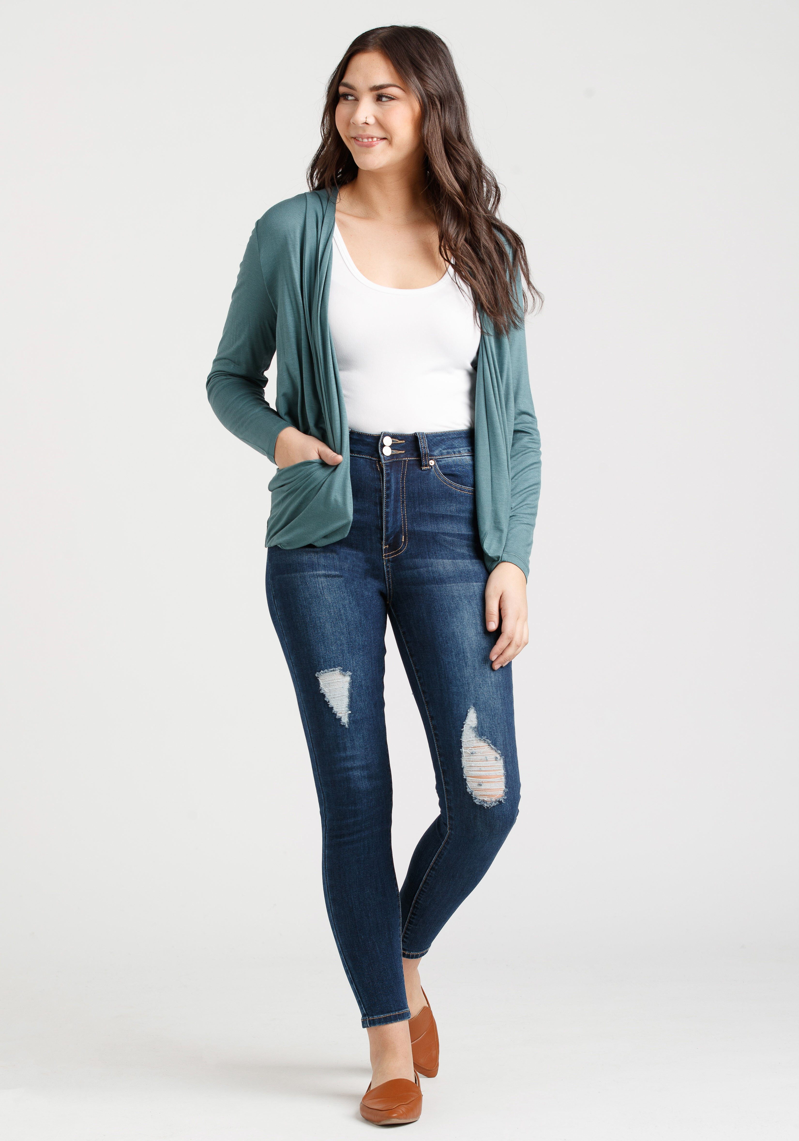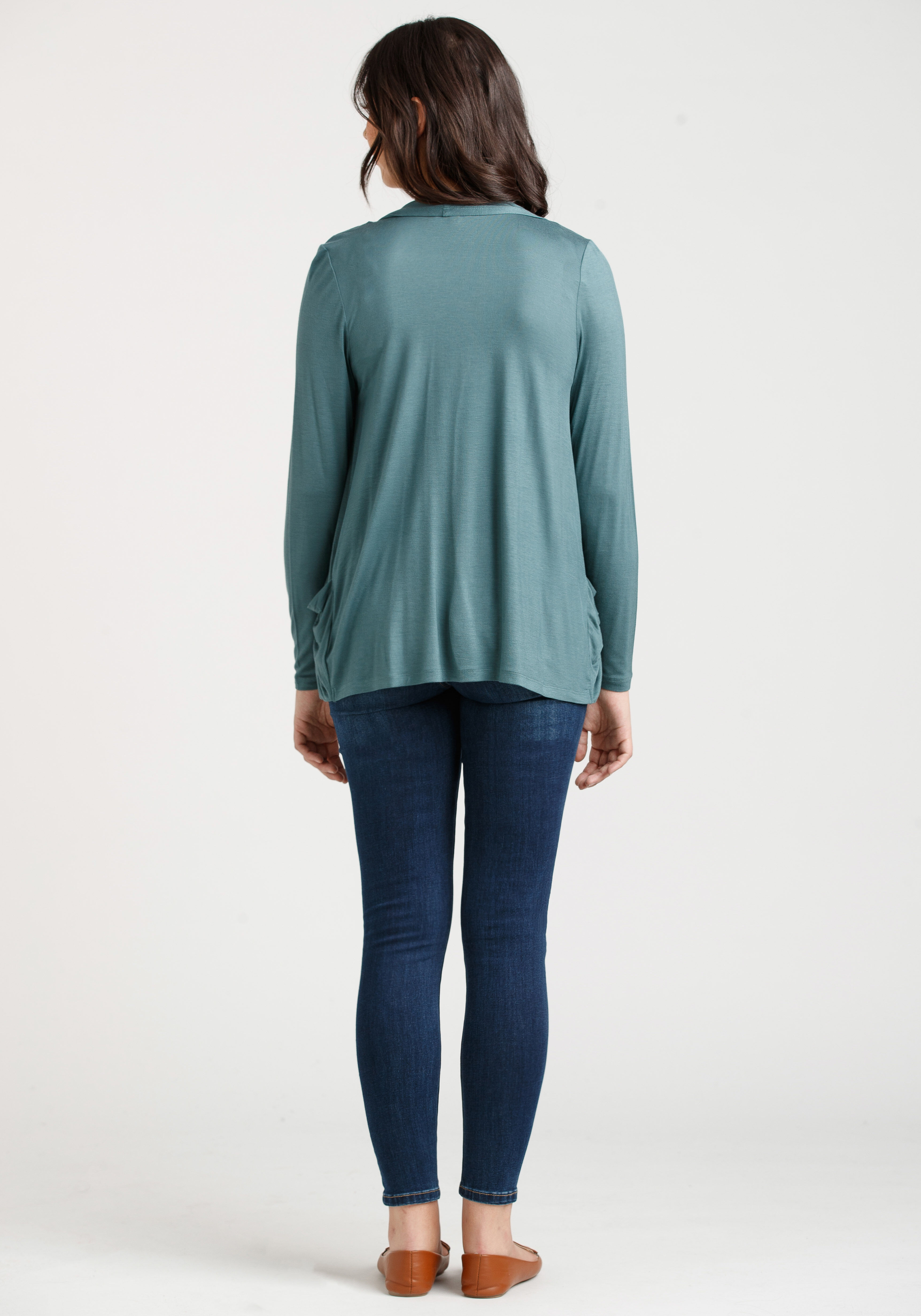 Rated 5 out of 5 by from Flattering and soft I love this cardigan! The shape flatters my plus size body, the colour is fantastic, and the fabric is soft and just the right amount of stretch. It even has pockets!!