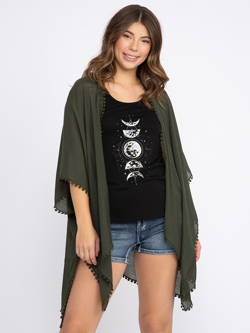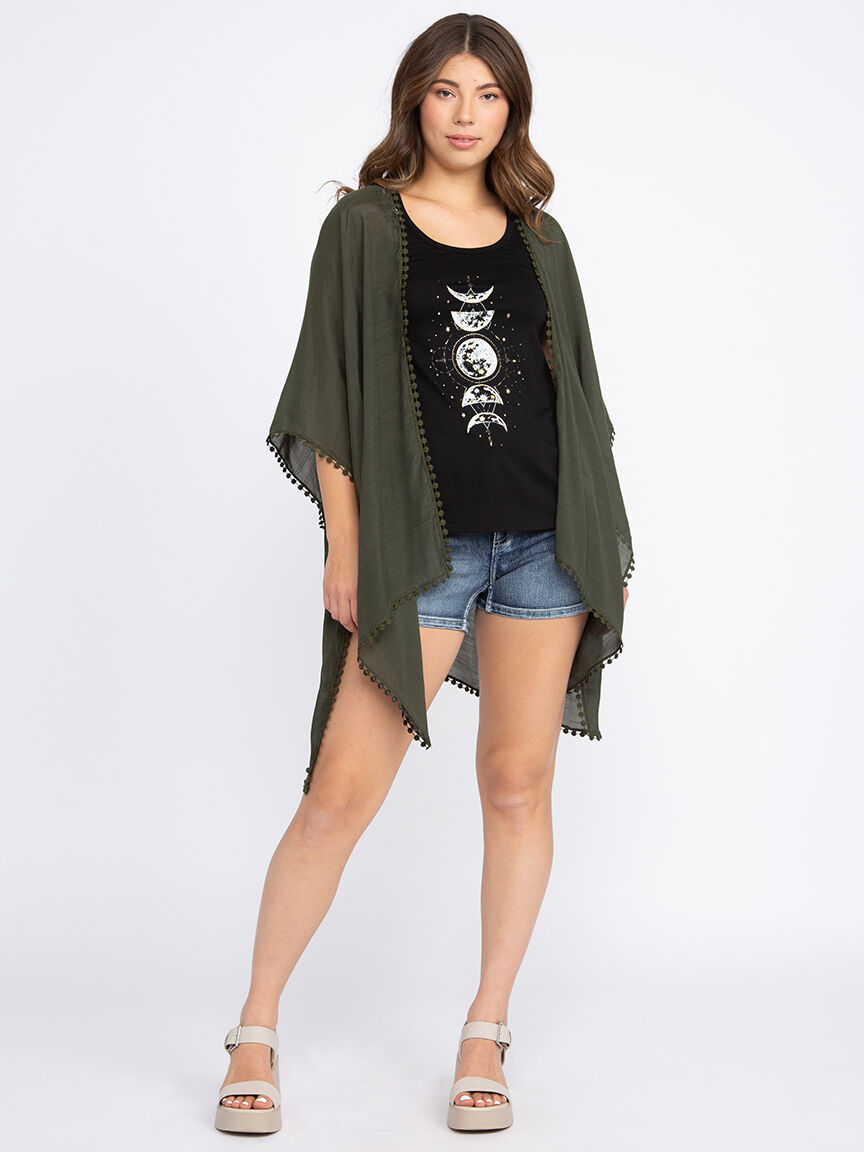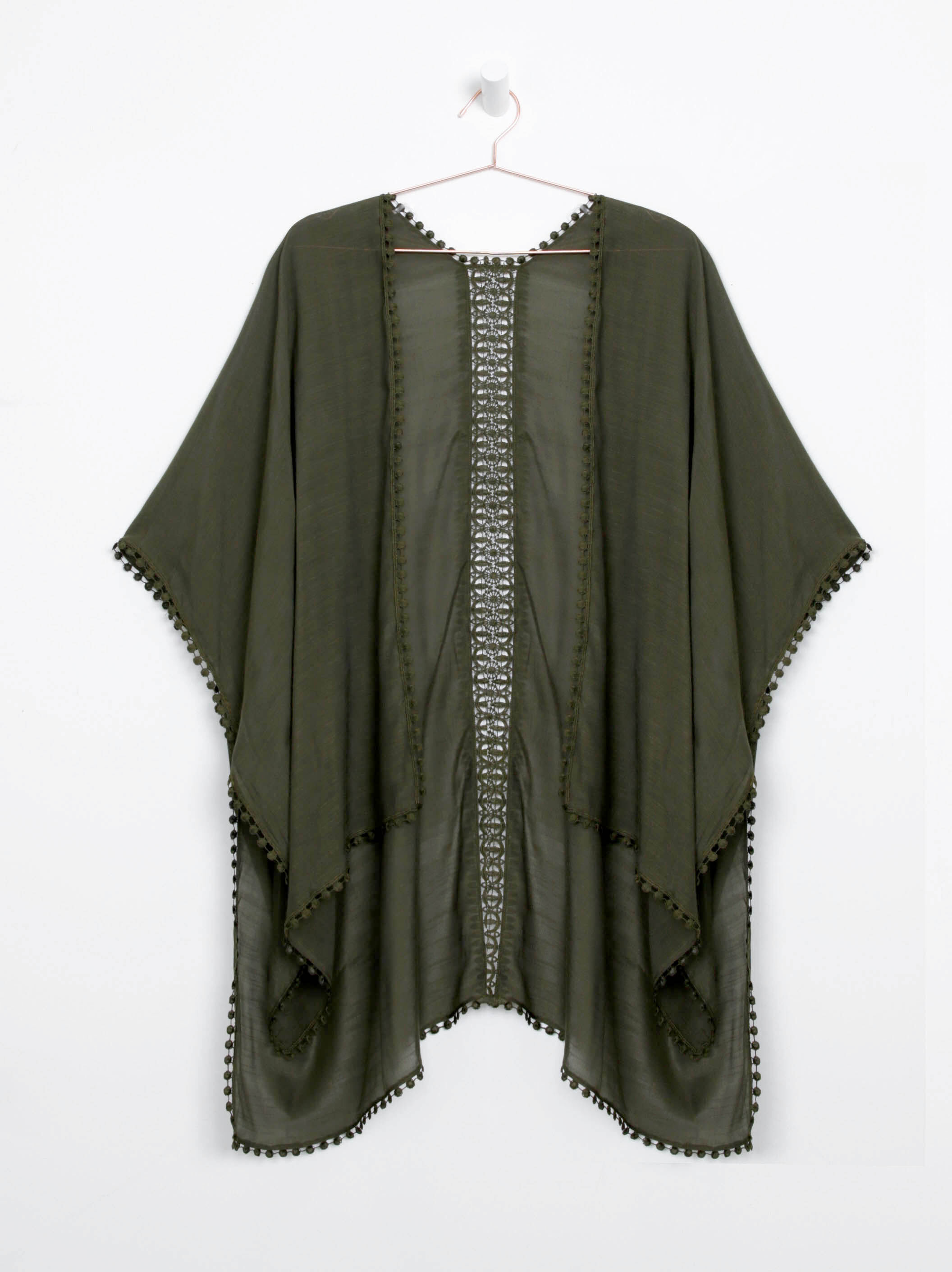 Rated 5 out of 5 by from Beautiful details This Kimono is stunning! The color is rich and the back lace detail adds such a stunning feminine touch. I grabbed this in green and black! Stunning with a pair of jeans, shorts or even tights. So incredibly light weight for those hot summer days.