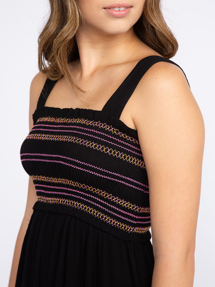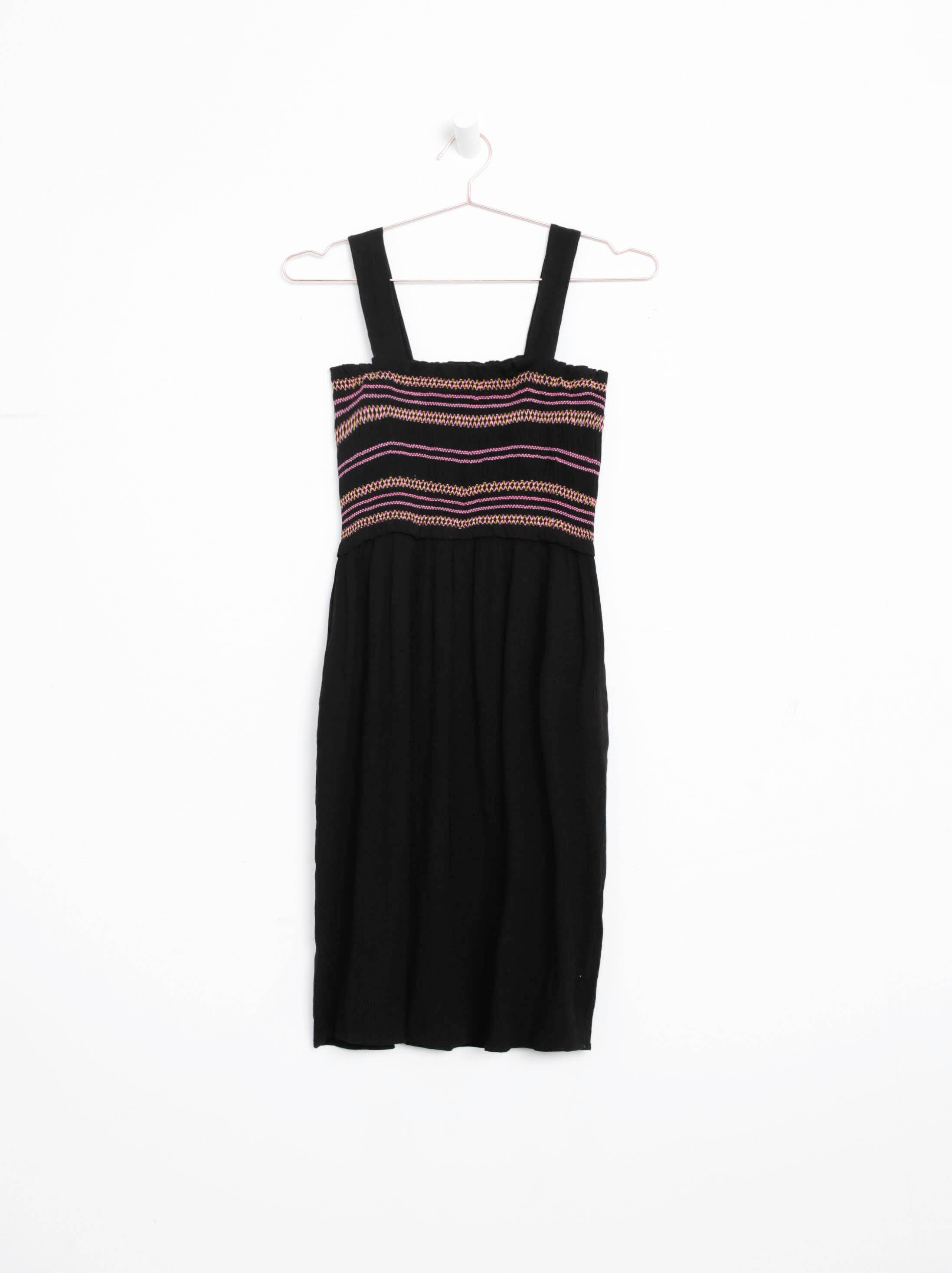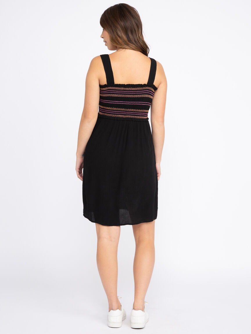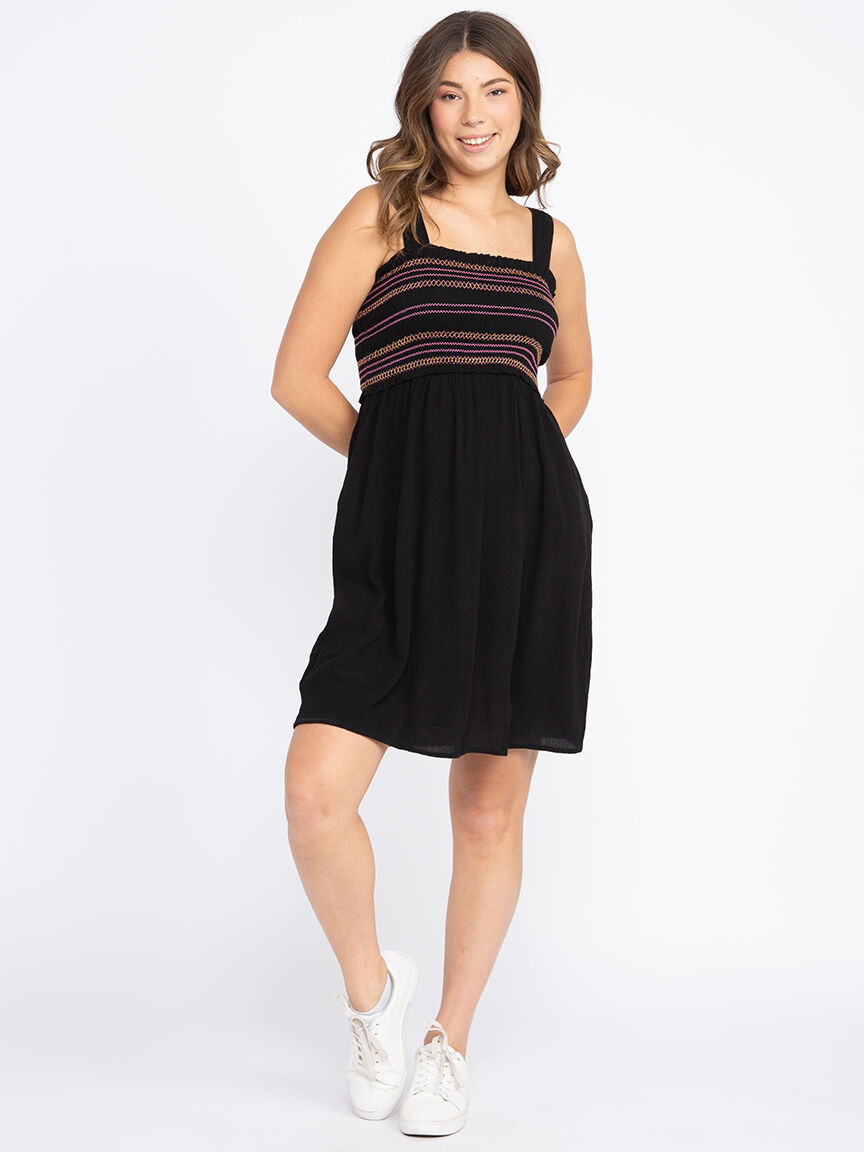 Rated 2 out of 5 by from Wanted to love this This review is not incentivized, and am hoping it helps someone who may be on the fence. I had really high hopes for this dress as it looks cute and has beautiful colours, but unfortunately it didn’t work for me. I found the smocked straps were tight where the armpit area is at the front (if that makes sense) and because of that it made me self conscious in that area. I also found that the material to be a bit stiff and wasn’t very comfortable, but that’s not a deal breaker. The biggest reason I couldn’t get this dress is it actually is see through. I know it’s black, but it’s extremely thin material, and as soon as I stepped out of the change room and looked in the mirror, you could see my underwear through it (and it wasn’t a light colour). My husband very rarely shops with me (but he was with me for this trip, and he immediately noticed that it was see through. Sad because I really wanted to love this dress!