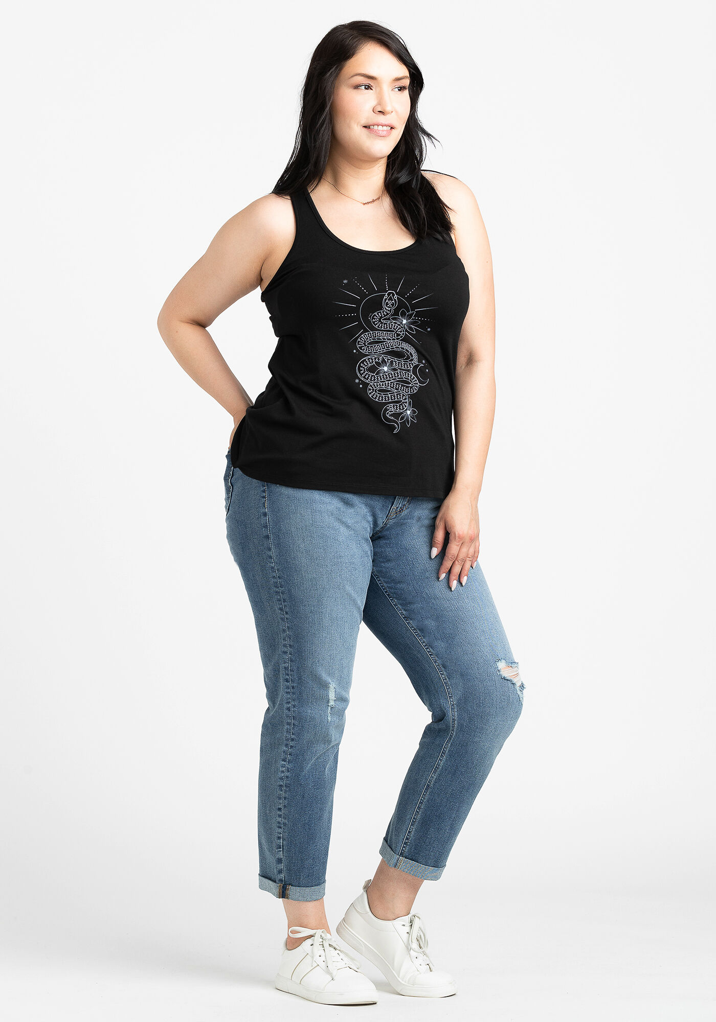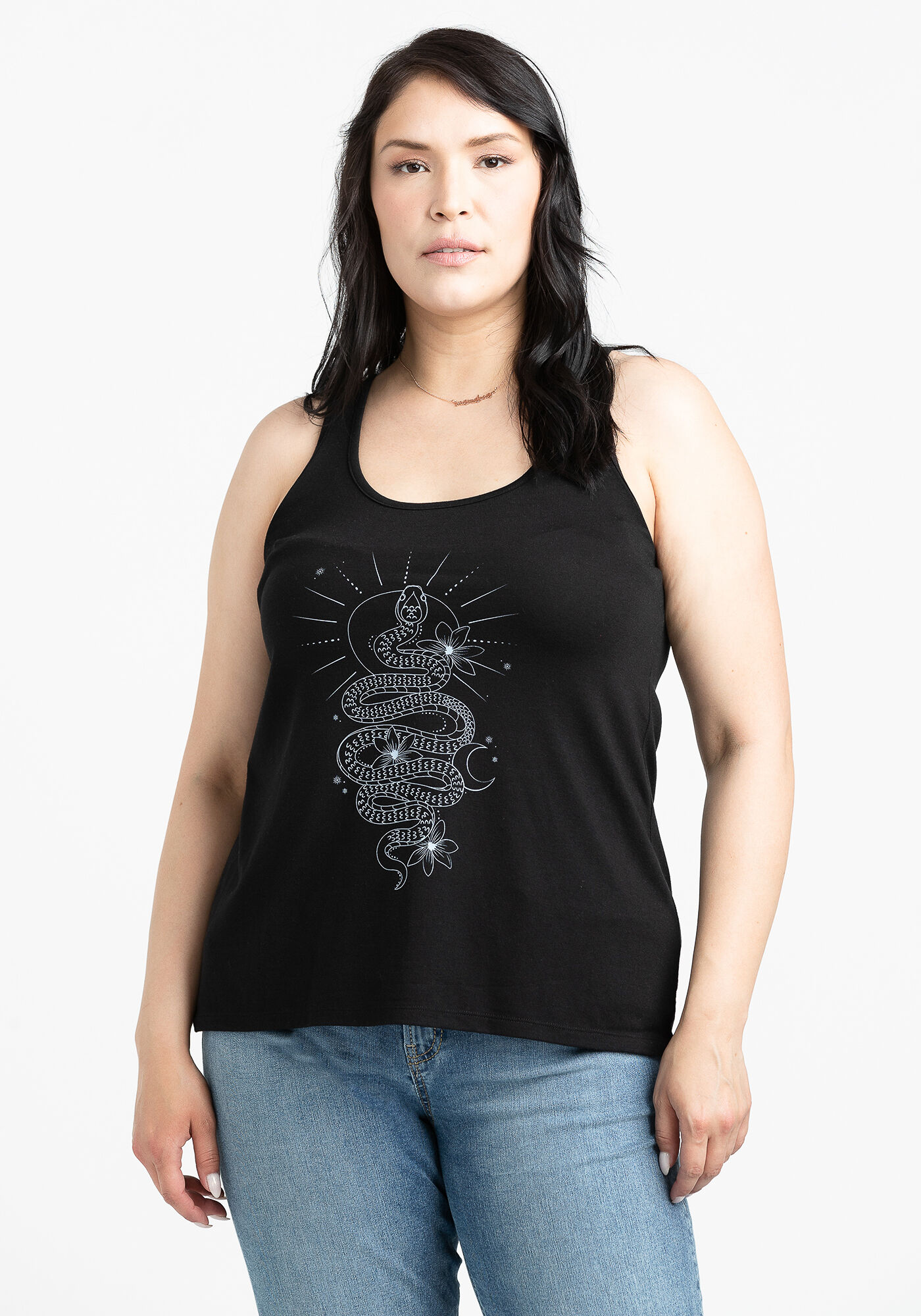 Rated 5 out of 5 by from snake tank top This top is a perfect fit! Snug around the chest and nicely blooms out around your waist. Beautiful AND comfortable!!