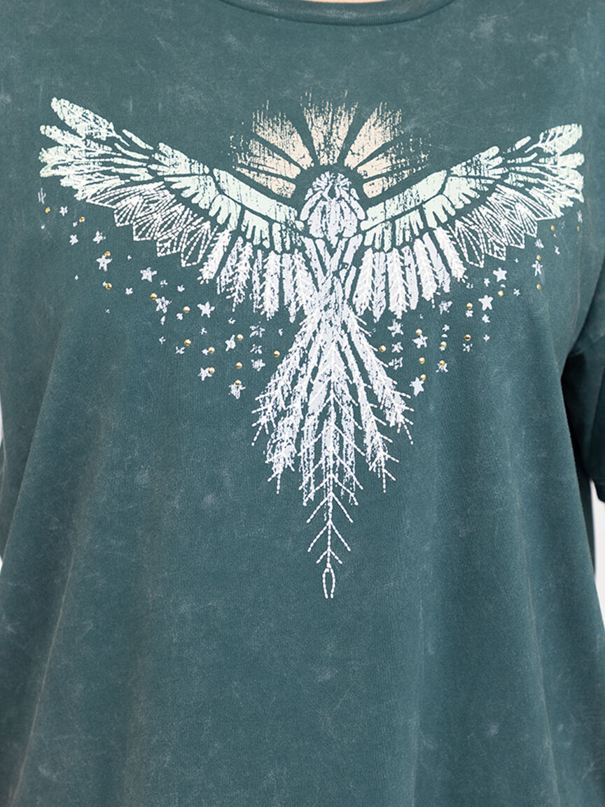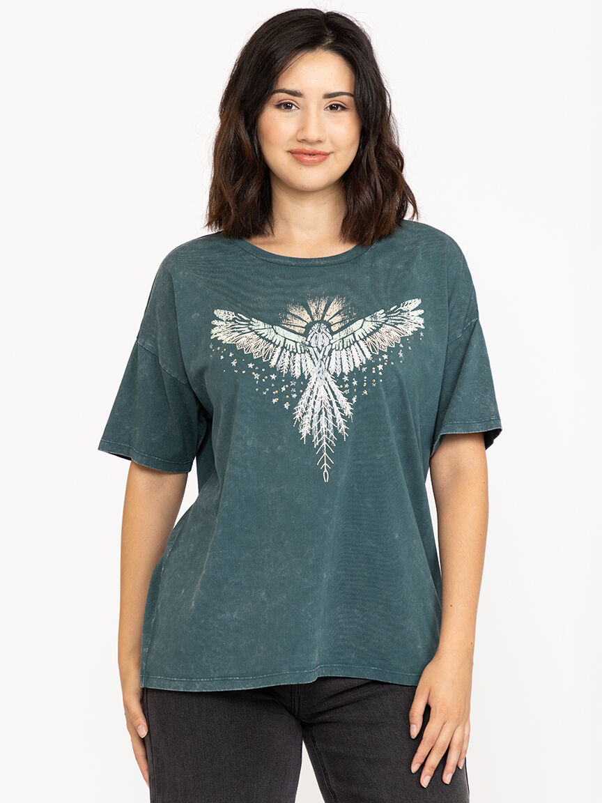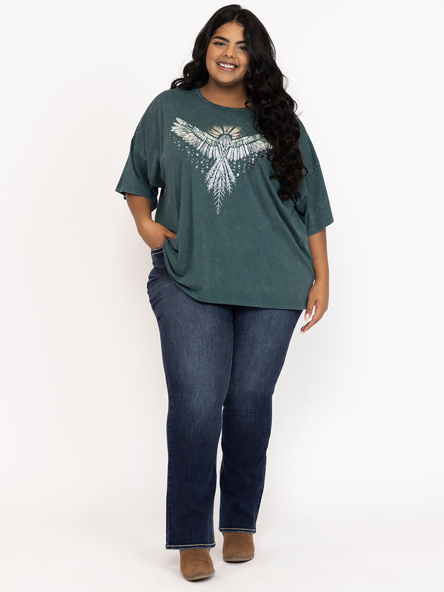 Rated 5 out of 5 by from Nice material and Color Tshirt Nice teal colored western themed larger sized top. I ordered size Large and I normally wear 1x or 2x. I didn't want it to be too loose and big fitting like the picture shown.